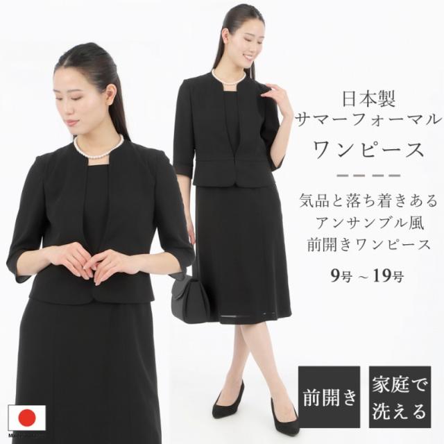 夏用 日本製 ブラックフォーマル ワンピース:FV14012 単品 お家で洗える アンサンブル風 国内縫製 大きいサイズ 弔事 慶事 婦人 礼服 喪服 日本製 黒 冠婚葬祭 葬儀 葬式 通夜 法事 法要 礼装 レディース