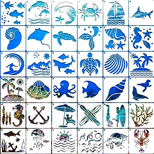 ステンシルシート36枚セッ描画テンプレート 36種類 海の生き物柄 絵図 手帳用テンプレート ステンシルプレート 塗り絵 製図用テンプレート D