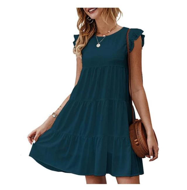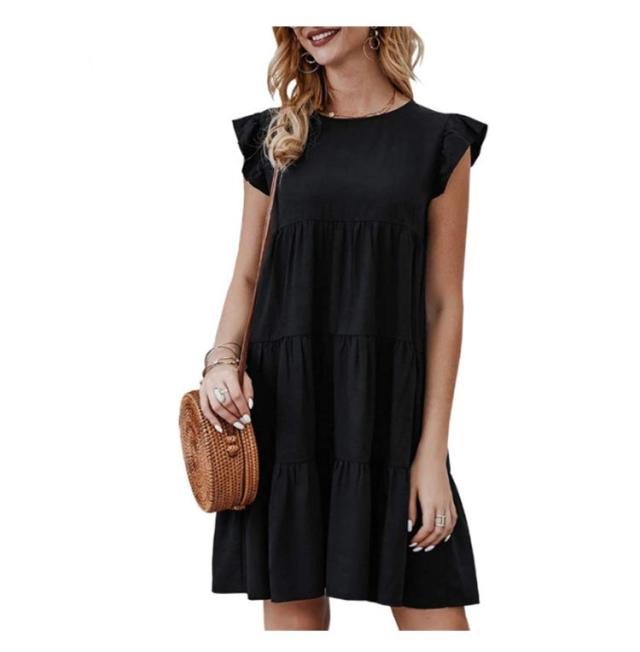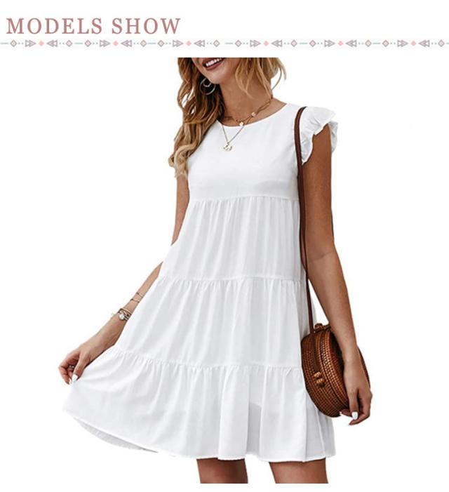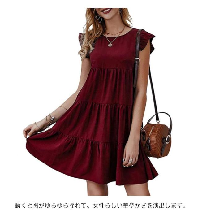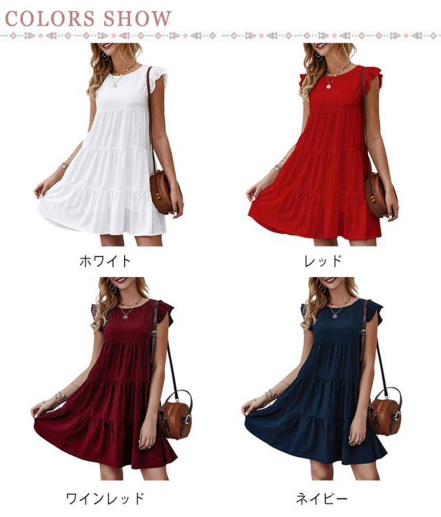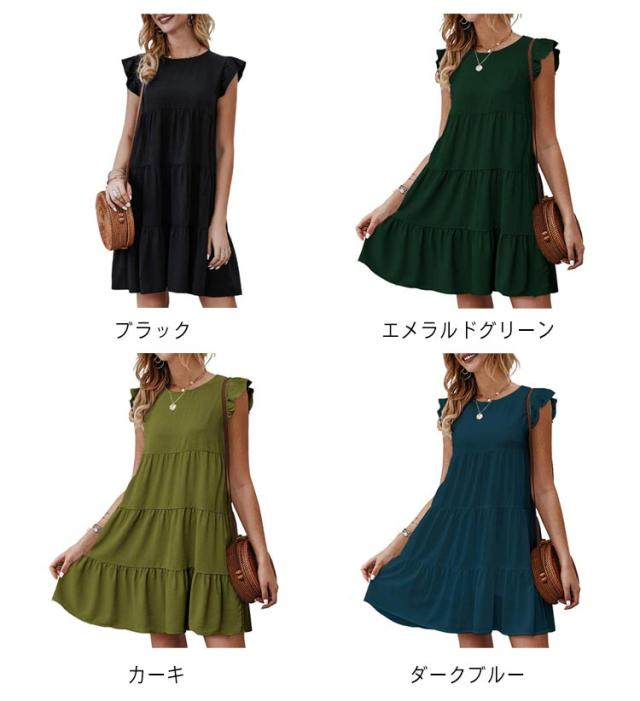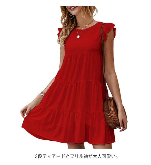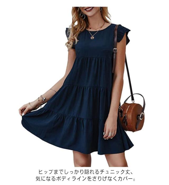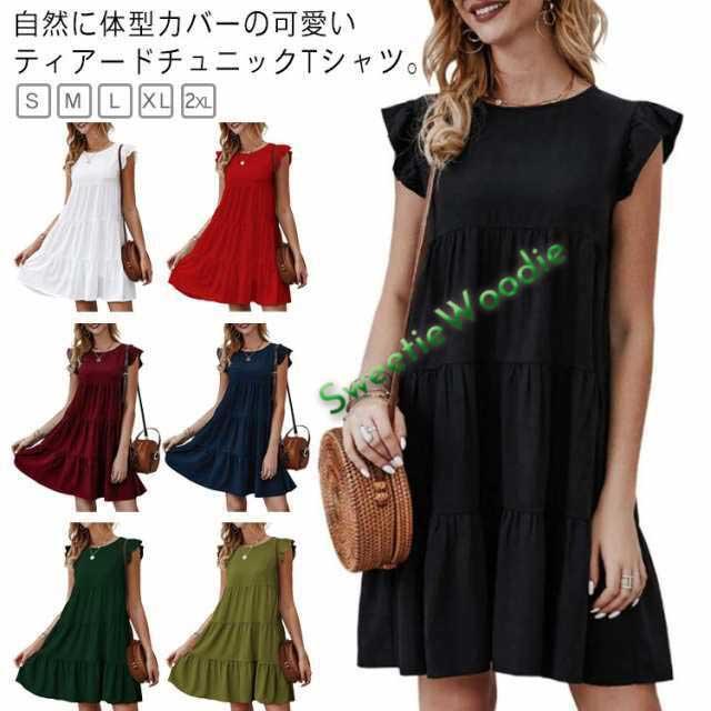 送料無料 Tシャツ ティアードチュニック フリル袖 ラウンドネック トップス カットソー ティアード フレア Aライン ミニワンピース 体型カバー 大人可愛い チュニックtシャツ ノースリーブ 春夏 お尻が隠れる