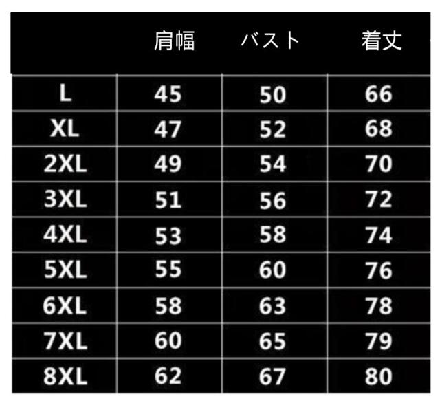 | サイズについての説明 | L XL 2XL 3XL 4XL 5XL 6XL 7XL 8XL サイズ:写真通り ※上記サイズは平置き実寸になります。サイズ表の実寸法は商品によって1-3cm程度の誤差がある場合がございます。 |