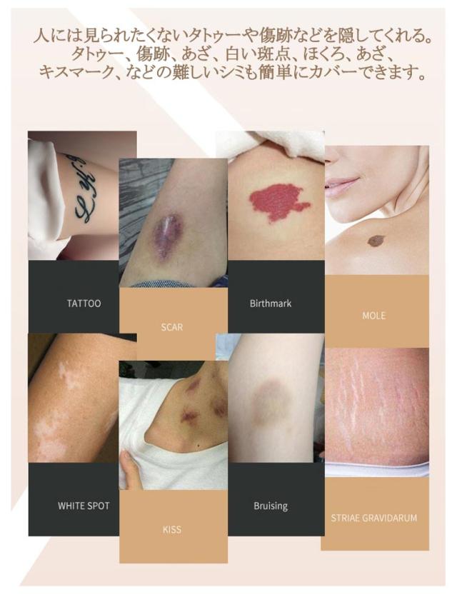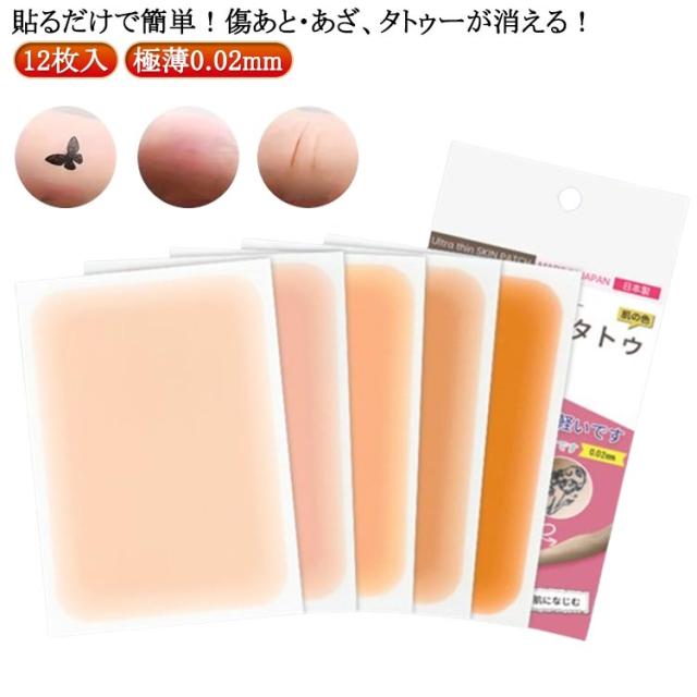 | 12枚入!貼るだけで簡単!傷あと・あざ、タトゥーが消える! 極うす0.02mmだからナチュラルな仕上がりに。 人には見られたくないタトゥーや傷跡などを隠してくれる。 タトゥー、傷跡、あざ、白い斑点、ほくろ、あざ、キスマーク、などの難しいシミも簡単にカバーできます。 水不要の転写タイプなので、いつでもどこでも貼ることができます。 温泉やプール、海でもお使いいただけるウォータープルーフ仕様。 | |