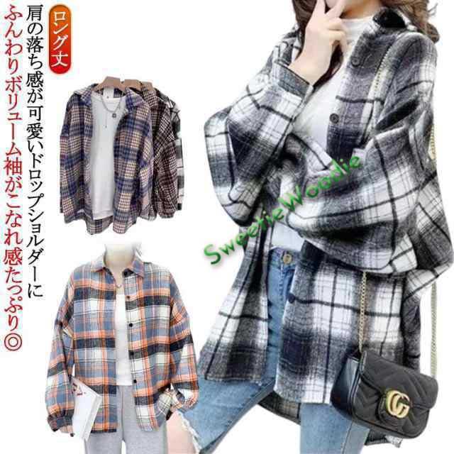 ネルチェックシャツ フリースネルシャツ ネルシャツ シャツ レディース ビッグシャツ オーバーサイズ アウター シャツコート 厚手 長袖 羽織り ロング丈 大きめ チェック 長袖 大人 体型カバー ボリューム袖 チュニックネルシャツ お尻が隠れる 春 秋 冬 韓国ファッション