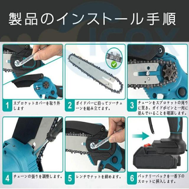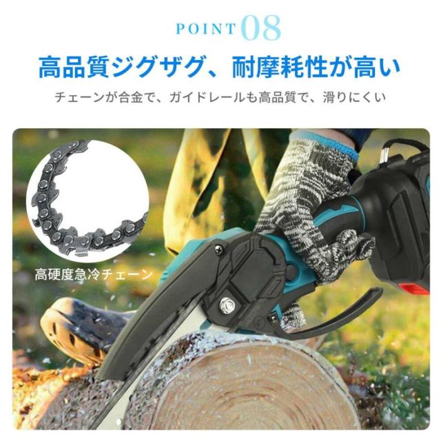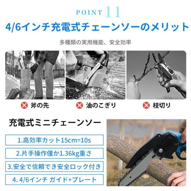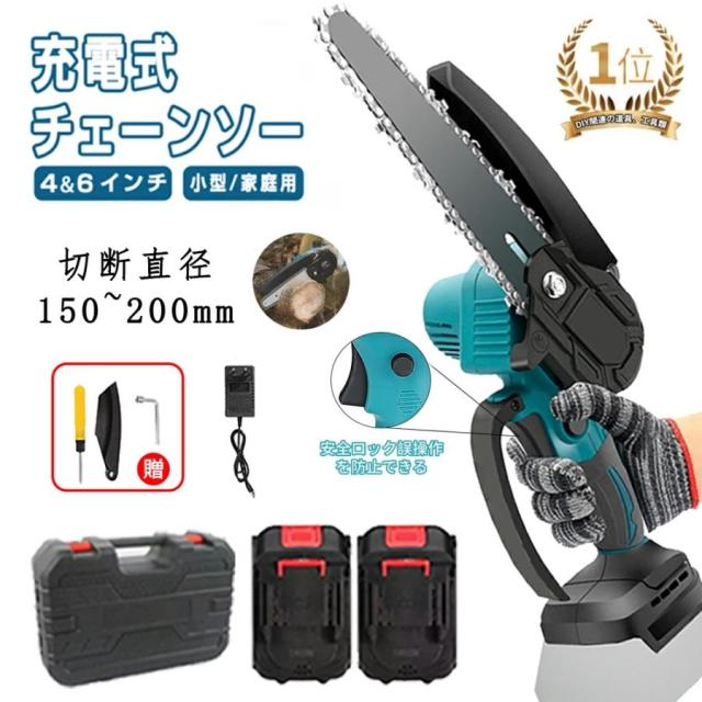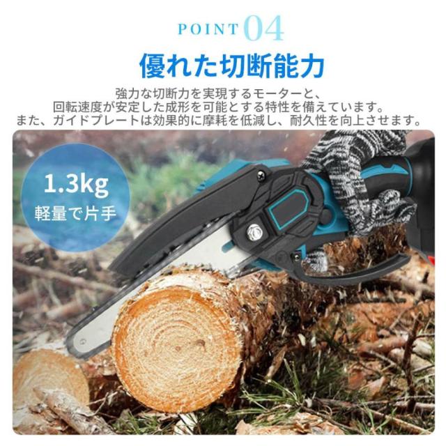 電動チェーンソー 充電式 電動ノコギリ 家庭用 小型電動のこぎり 片手軽量 強力 木工切断 枝切り 園芸設備 庭木 電動工具 4/6インチ マキタバッテリー互換対応