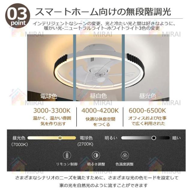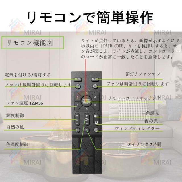 【正逆回転可能・サーキュレーター付き・オールシーズン対応】このファンライトはお部屋の真ん中で気流のポンプのように空気を循環しながら、メインライトとして家族を明るく照らしてくれます。空気の性質である上に溜まりやすい熱気と、下に溜まりやすい冷気を効率よく循環。夏は天井の熱気を拡散するため、風を部屋全体に行き渡らせます。また心地よい風がカラダにあたることで体感温度を下げることができます。 冬は床にたまった冷気を吸い上げ、暖かい空気を足元へ送ることで、部屋の温度ムラを解消してくれます。春秋に自然風量設定して、空気を循環させるとともに、部屋に干しした洗濯物も乾きやすいです。一年中お使えいただけます。実用感たっぷりです。 【革新的な三相DCモーター・風量80% UP・静音稼働】このファンライトは革新的な三相DCモーターを採用し、立体形状の5羽根を組み合わせ、高回転80% UPを実現、90W相当爆発的な超高風量を放ちます。ACモーターと比べて直流電源で動くDCモーターを使うファンライトは省エネ性に優れていることと、ゆっくりとしたリズム風の設定ができること、何よりも運転音を30%低減するのが特徴です。就寝時にシーリングファンを回したいけど音が気になってしまうという人、夏以外の季節や、換気の悪い密閉空間でも空気の循環を良くするためにファンを24時間、ゆっくり回しておきたい人におすすめです。 【長寿命で省エネなLED搭載・無階段調光調色・リモコン付き】ファン付きシーリングライトは高品質なLEDライトを搭載して、リモコンで「輝度」「CCT」ボタンを長押してお部屋の雰囲気やシーンに合わせて純正色温度3000K?6500Kの昼光色・昼白色・電球色の3色温度10%?100%までの無階段切替が可能です。安定したLED全光束4000LMの明るさを提供し、耐用年数 50,000時間に達し、5年間交換不要で、省エネで長寿命を実現!色と明るさの変化に応じて部屋に良い雰囲気を作り出すことができます。寝室、リビングルーム、台所、廊下、書斎、玄関、トイレ、オフィスなど様々なシーンで活躍です。 【常夜灯モード・タイマー機能・メモリー機能】 LED天井ファンライトは低消費電力の10%電球色(3000K)の雰囲気ランプ常夜灯付いており、一人寝て始めてのお子様の部屋また夜間授乳、お年寄りの看護などに最適です。ライト・ファンそれぞれ独立運転可能で1H/2H/4Hのタイマー機能を設定すると、自動的にシャットダウンできます。ライトとファンの消し忘れを防ぎ、電気代も節約できます。またメモリー機能が搭載されたので、オフする直前の状態が再現されます。個人や家族の好みや日常的なニーズに対応可能!