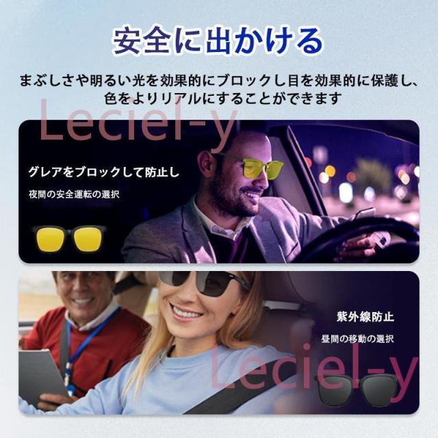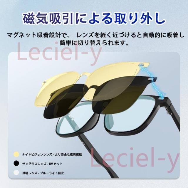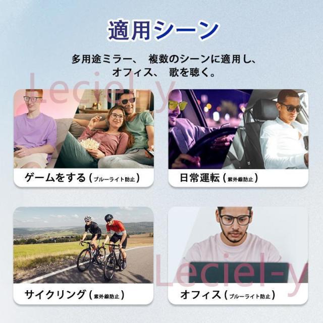 【1つの眼鏡の3つの使い方】<br>透明レンズ??ブルーライト防止<br>サングラスレンズ??紫外線カット<br>ナイトビジョン??夜間の運転はより安全<br><br>まぶしさを解消し、目の疲れを軽減し、目を保護し、視界をクリアにします。<br><br>デュアルスピーカーとステレオ効果音で、ドライブ、スポーツ、仕事に最適です。<br><br>サングラス + ヘッドセットのデザインで、通話に応答/アップ、再生/一時停止、前/曲を再生できます。<br><br>サングラス、オープンイヤーデザイン、鼓膜の損傷なし、ほとんどの人に適しています。<br><br>心ゆくまでワイヤレスで音楽を楽しめ、ハンズフリー通話で運転中の危険を回避できます。