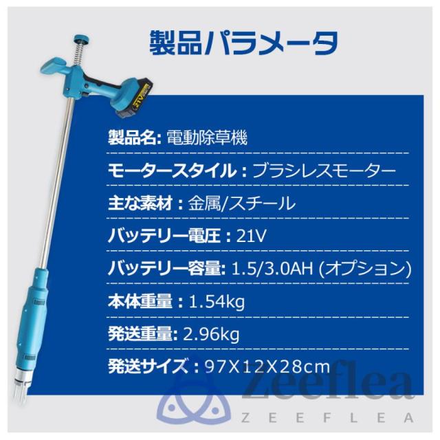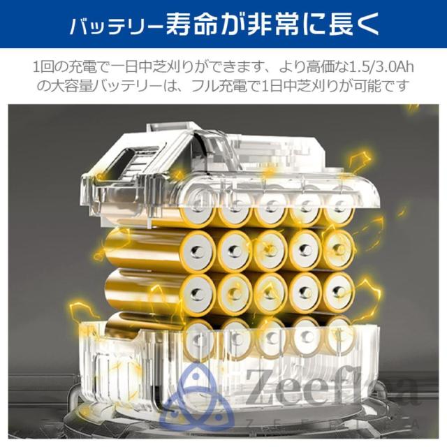 この電動草刈り機は、3.0Ah容量のバッテリーを搭載しており、フル充電で1時間利用可能。2つのバッテリーで3時間連続ご利用頂けます。作業をスムーズに完了させることができます。また、マキタ21Vバッテリーと互換性があり、さまざまなニーズに対応できます。