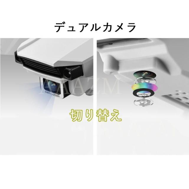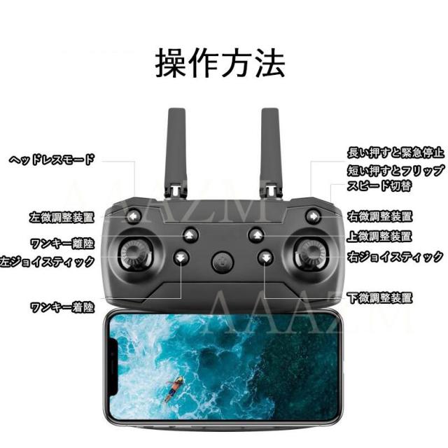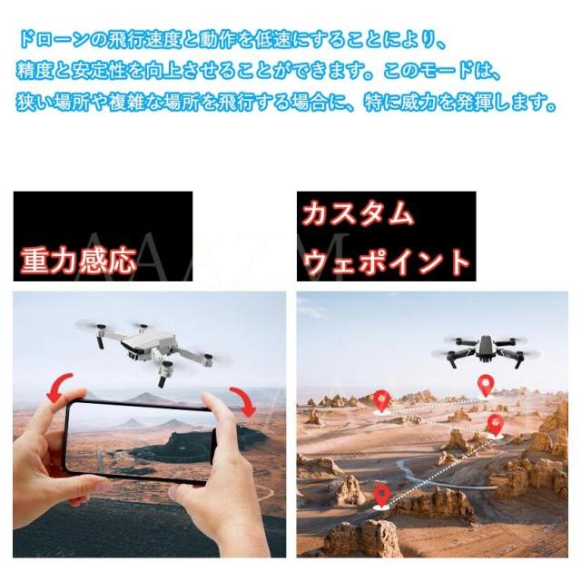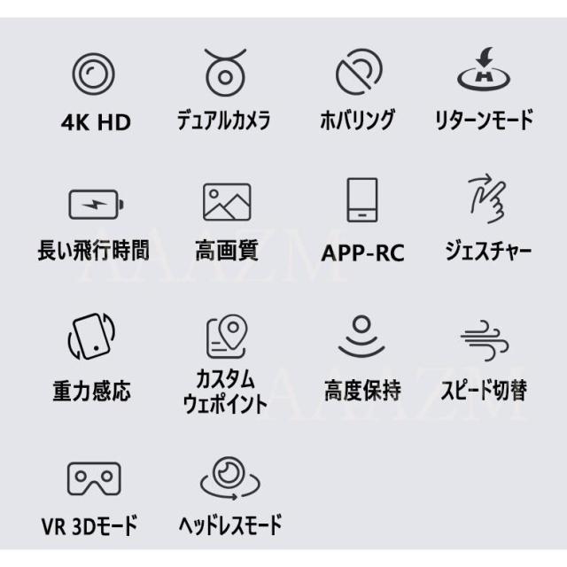 機能:前後/左右、ホバリング(高度保持)、ヘッドレスモード、三段スピード切替、写真/録画、ワンキー離陸/着陸、緊急停止、ジェスチャーで写真、ジエスチャーで録画、リターンモード、ウェイポイントモード、フリップモード、スマホ連動APP-RC、APP-RC重力センシング制御、VR3D体験