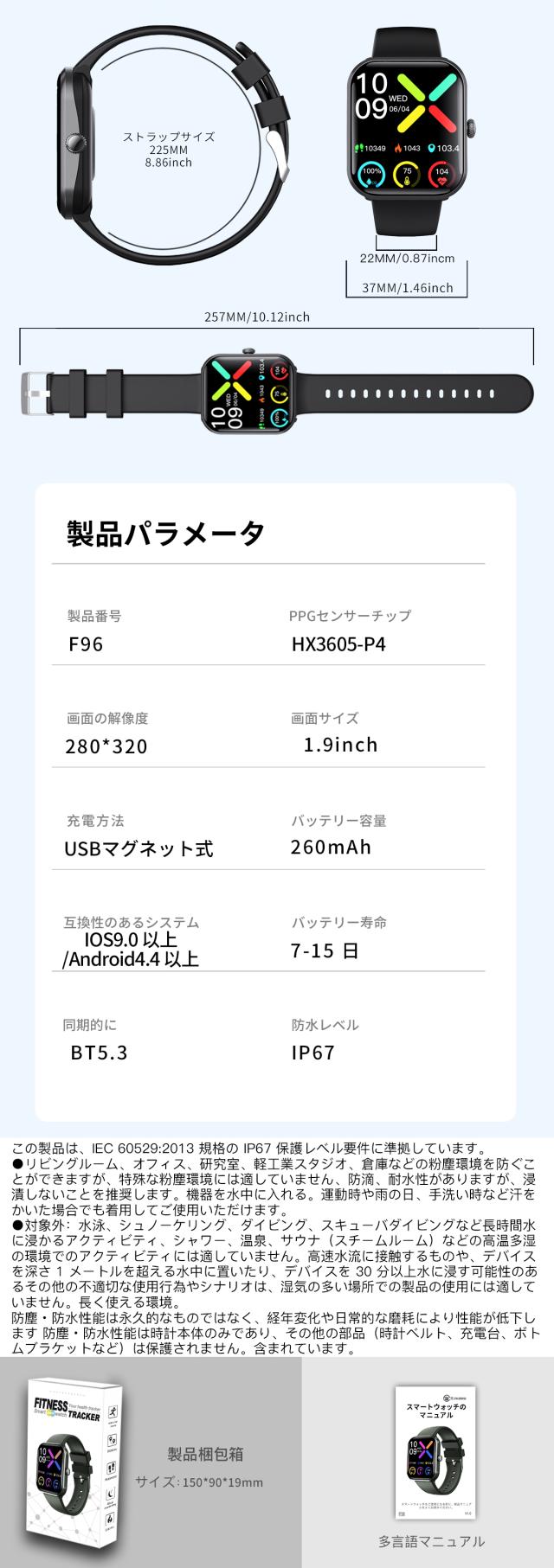 ☆閲覧いただき、誠にありがとうございます☆ 基本仕様 製品型番:F96 重量:39g ディスプレイ:1.9インチ バッテリ容量:260mAh コネクター:マグネット吸着式 ※本製品は医療機器ではなく、測定機能付きスマートウォッチであり、測定値は参考値です。 測定された数値は、専門的な医療機器の結果と比較できるものではありません。 ○使用上の注意事項○ ※改造/本来の目的以外/強い衝撃などはお控え下さい。 ※仕様は改善の為に予告なく変更する場合があります。 ※ディスプレイ画面等の環境上、写真と実際の商品の色とは多少違う場合がございます。