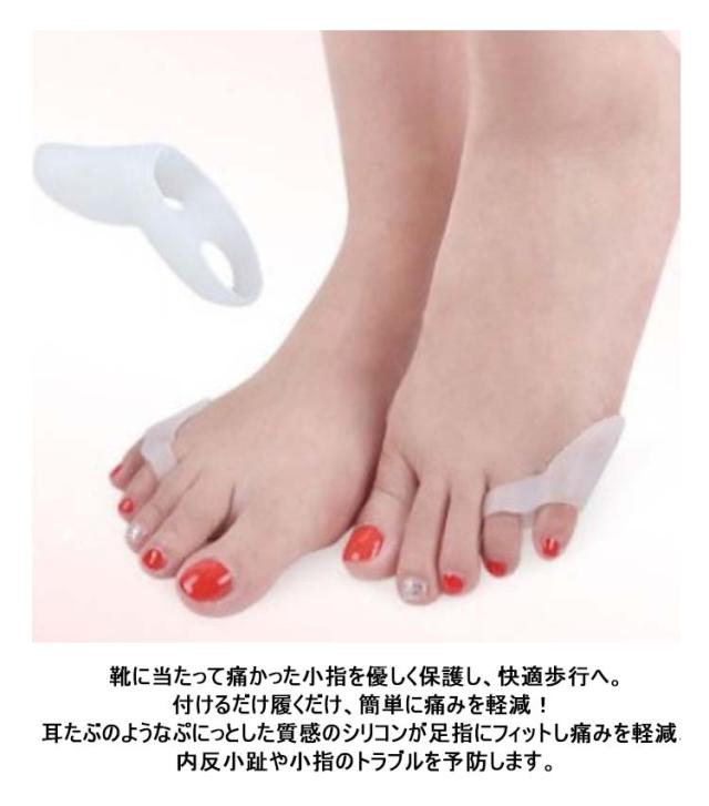 | 歩行時の衝撃を抑え、小指を優しく保護♪ シリコン素材を使用。柔らかく肌に優しく、痛い内反小趾、タコ、寝指対策、痛み軽減に! 靴に当たって痛かった小指を優しく保護し、快適歩行へ。 付けるだけ履くだけ、簡単に痛みを軽減! 耳たぶのようなぷにっとした質感のシリコンが足指にフィットし痛みを軽減、内反小趾や小指のトラブルを予防します。 小指と薬指に装着するため外れにくく、小指と薬指との間を広げるから、歪んだ小指を正常な位置へ戻すようサポートします。 水洗いできるので、衛生的に繰り返し使用可能です。 | |