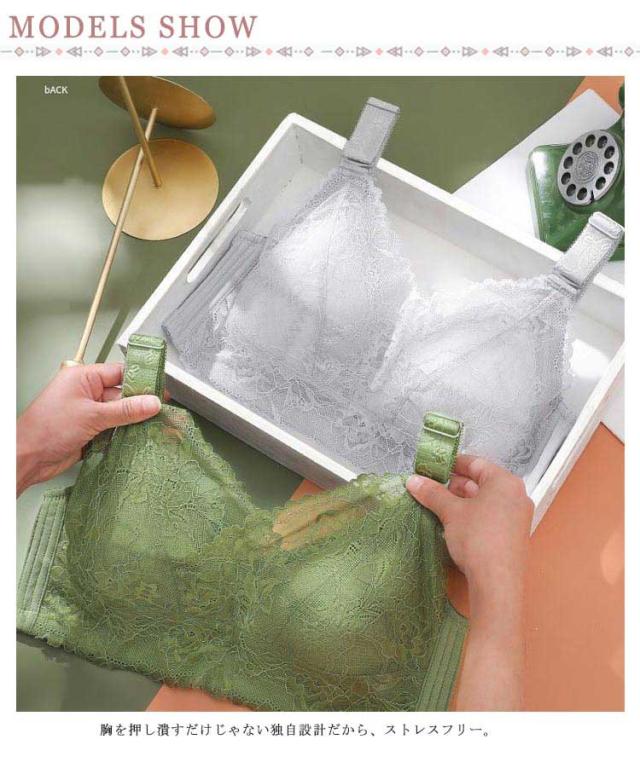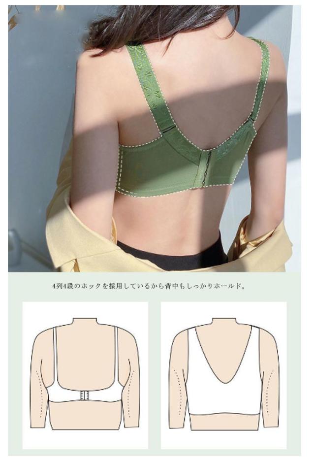 | より胸を小さく見せるようカップの膨らみは極限まで抑えつつ、自然で美しいバストラインを実現。 胸を押し潰すだけじゃない独自設計だから、ストレスフリー。 バスト全体をレースで覆っているので苦しくなりません。 脇高デザインで肉が脇に流れるのを防ぎ、気になるはみ肉の凸凹もスッキリ綺麗に。 より脇のほうまでワイヤーを伸ばすことで、脇肉を集めてシルエットをスッキリさせます。 肩への負担が少ない太めのストラップを採用。 4列4段のホックを採用しているから背中もしっかりホールド。 動きやすさはもちろん、バストを美しく保つためにも大切です。 | |