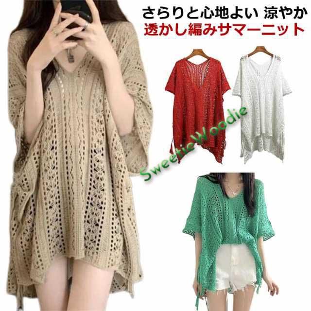 透かし編み ニット 大きいサイズ プルオーバー サマーニット レディース 半袖 Vネック メッシュ 透かし編みニット 春服 ドルマンスリーブ 5分袖 五分袖 おしゃれ 編み ゆったり 透ける ふんわり 体型カバー 日焼け防止 冷房対策 無地 透け感 送料無料