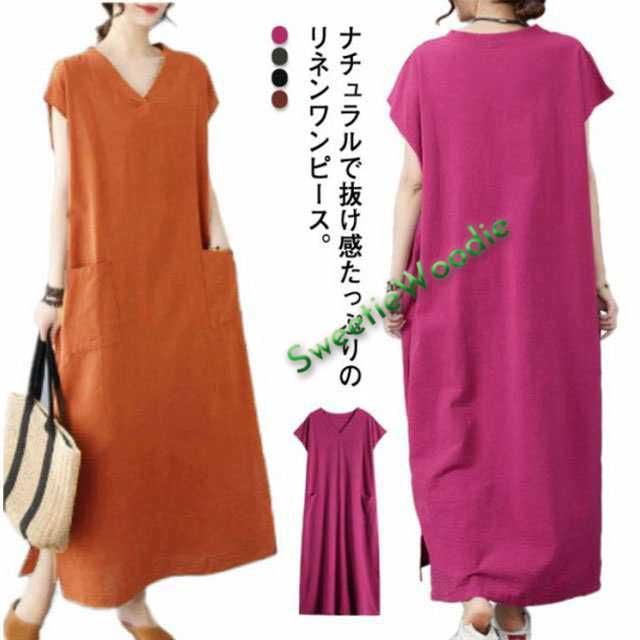 ロングワンピース リネンワンピース 大きいサイズ コットンリネン 涼しい マキシワンピース フレンチスリーブ ワンピース 半袖 Vネック ポケット付き 夏服 新作 スリット入り ゆったり 体型カバー ナチュラル 森ガール