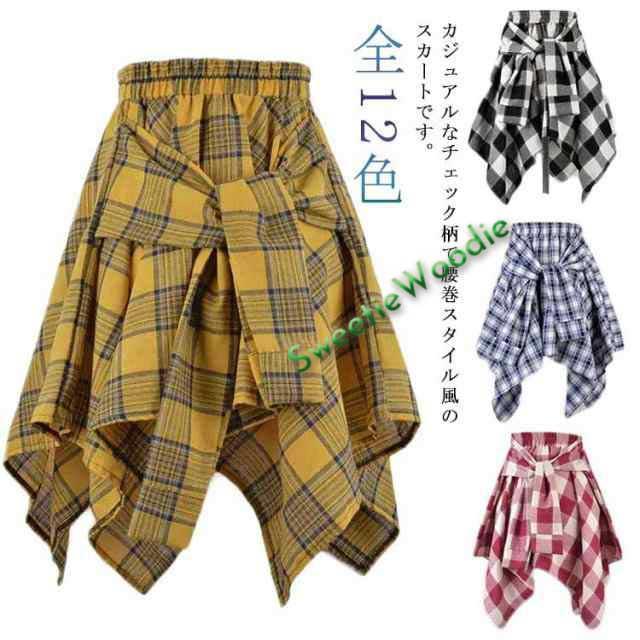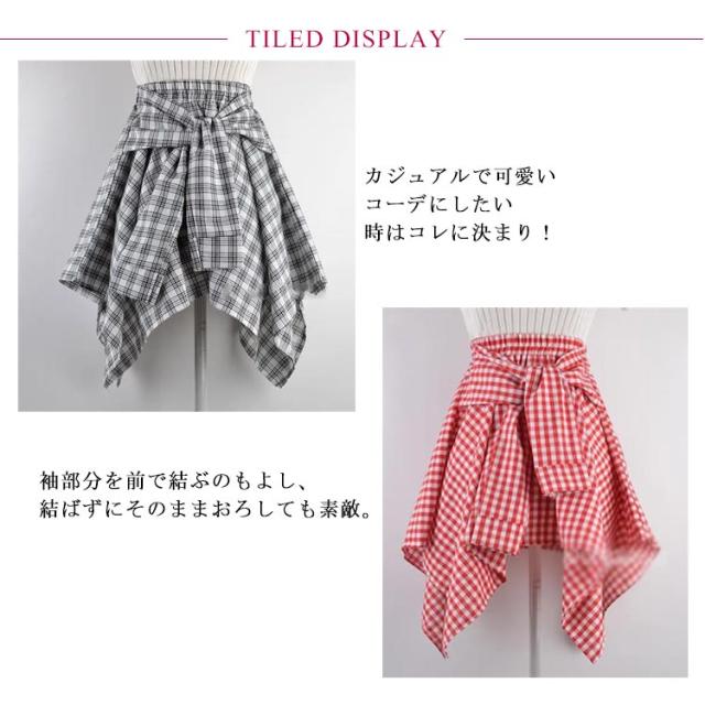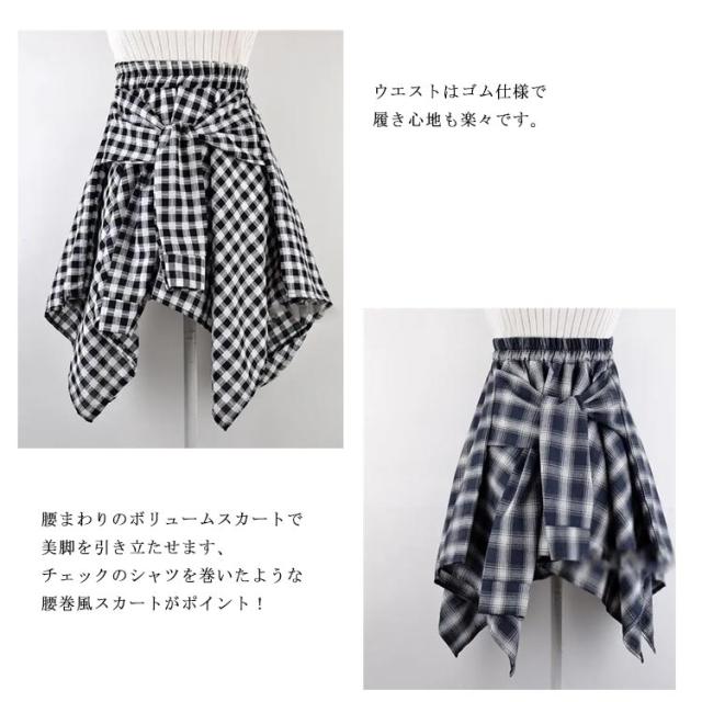 | カジュアルなチェック柄で腰巻スタイル風のスカートです。 シャツを巻いているようなデザインがオシャレポイント、動きのある裾ラインが印象的でレギンスと合わせても。 ウエストはゴム仕様で履き心地も楽々です。 腰まわりのボリュームスカートで美脚を引き立たせます、チェックのシャツを巻いたような腰巻風スカートがポイント! 袖部分を前で結ぶのもよし、結ばずにそのままおろしても素敵。 カジュアルで可愛いコーデにしたい時はコレに決まり! | |