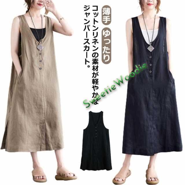 リネン サロペット スカート Vネック レディース ジャンパースカート ロング丈 綿麻混 ナチュラル 薄手 涼しい コットン オールインワン ゆったり 体型カバー ポケット付き きれいめ カジュアル 春 夏 秋 ブラック 黒 ベージュ 30代 40代 50代