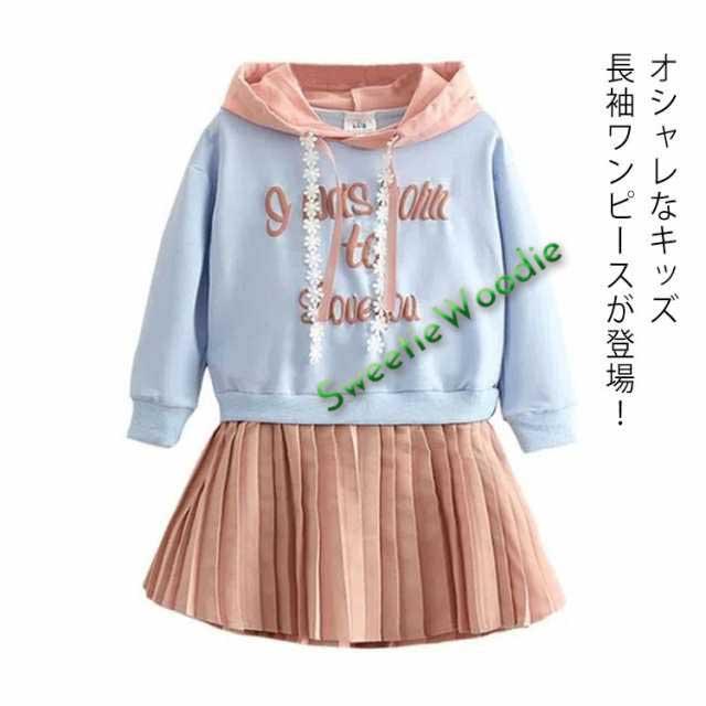 ガールズワンピース 長袖 女の子 スウェット パーカーワンピース 子供服 キッズ 長袖ワンピース 春秋 プリーツデザイン フード付き 花柄 カジュアル 普段着 可愛い 通園 通学 プレゼント ギフト