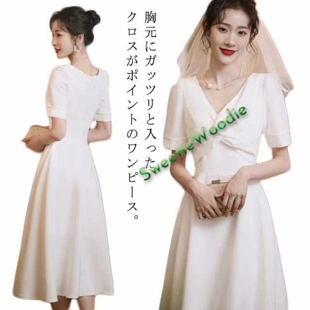 パーティードレス 胸元クロス ワンピース ドレス Vネック 半袖 フレアワンピース aラインワンピース ロング丈 サテン 韓国風 ミニマル 白 ホワイト エレガント 結婚式 発表会 披露宴 お呼ばれ 二次会【送料無料】