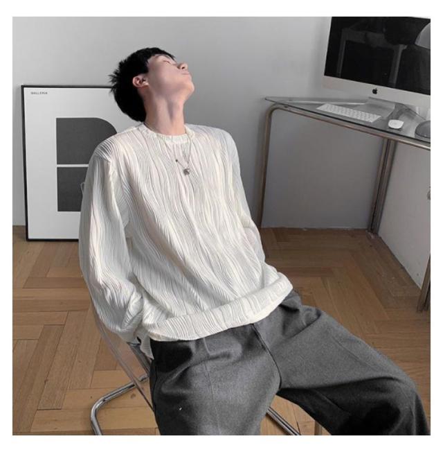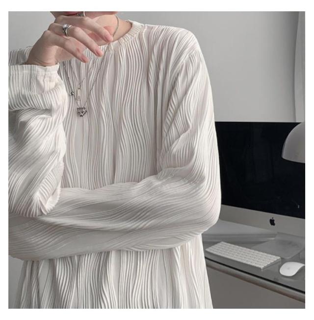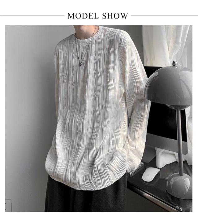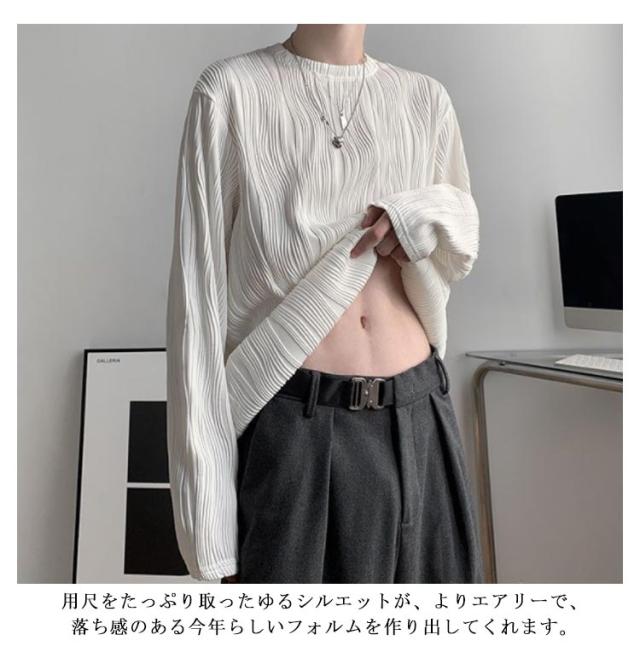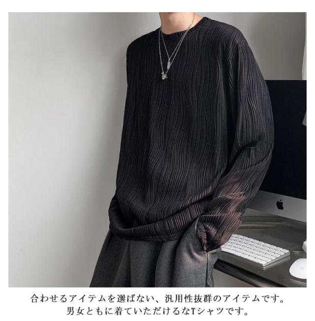 | 様々な着こなしに合わせやすい凹凸のあるミニプリーツ長袖Tシャツ。 テロンと独特なシワ感を作り出す、ポリエステル×レーヨンの滑らか素材を使用。 深い袖ぐりから身頃に沿って、ゆったりと滑らかに流れるドレープ感が、コーディネートに絶妙なヌケ感をプラス。用尺をたっぷり取ったゆるシルエットが、よりエアリーで、落ち感のある今年らしいフォルムを作り出してくれます。 1枚での着用はもちろん、季節が進んだ際にはインナー使いもおすすめ。合わせるアイテムを選ばない、汎用性抜群のアイテムです。男女ともに着ていただけるなTシャツです。 | |