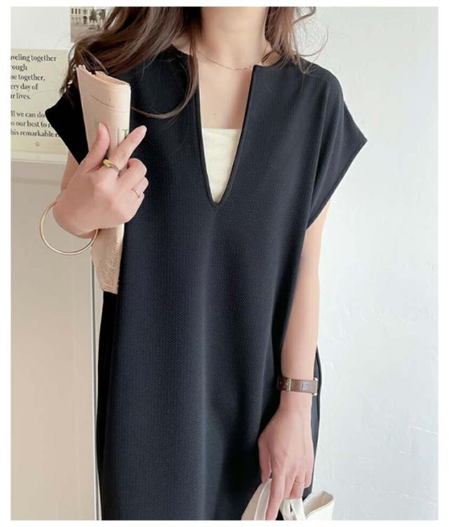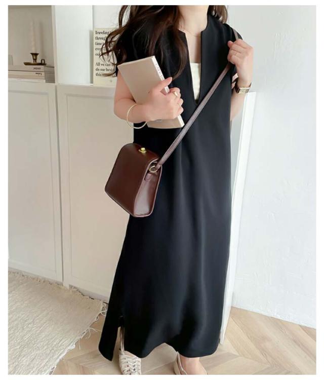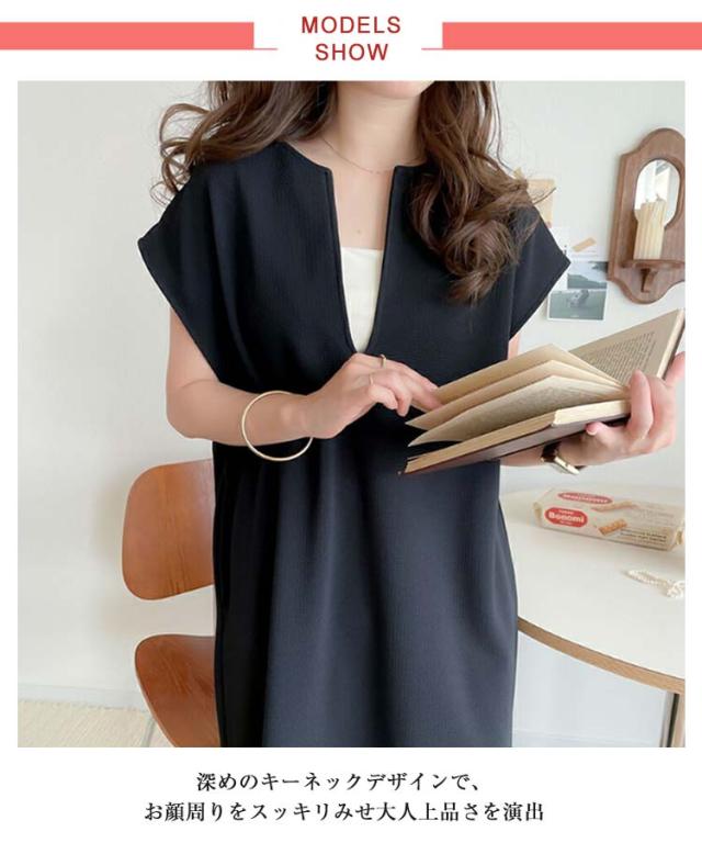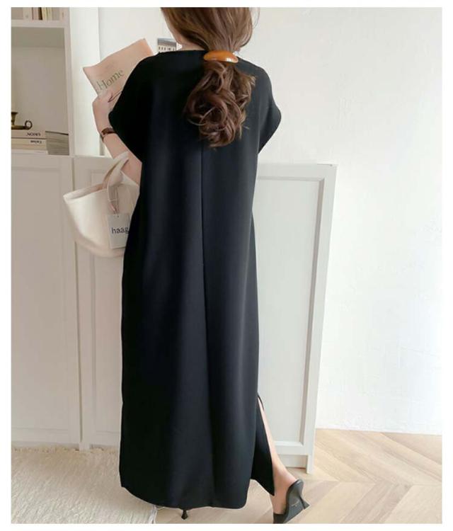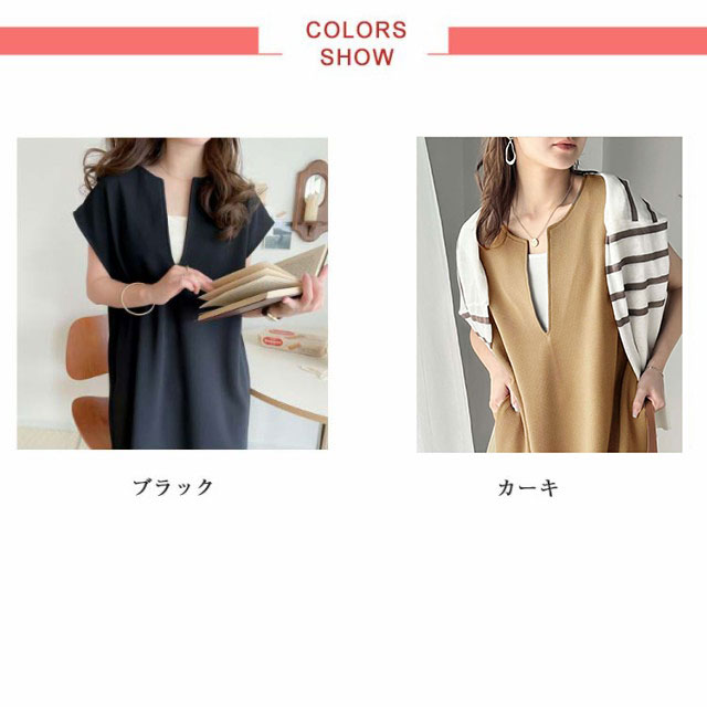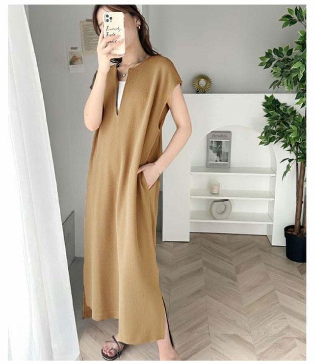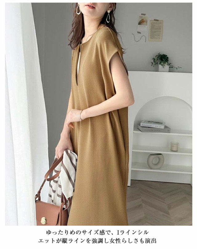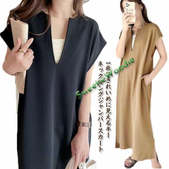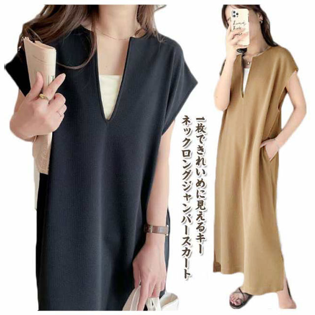 送料無料 ジャンパースカート レディース ロング ジャンスカ キーネック 深め ロング丈 ワンピース サイドスリット 春 夏 秋 シンプル 無地 体型カバー ゆったり レイヤード コーデ 上品 大人 きれいめ