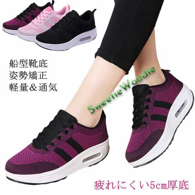 レディース 厚底スニーカー 船型底 5cm 厚底 スニーカー ダイエットシューズ 船型底ナースシューズ ウォーキングシューズ レースアップ 履きやすい ランニング エアクッション メッシュ 通気性 軽量 黒 ピンク パープル