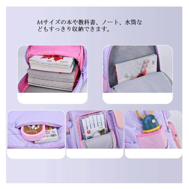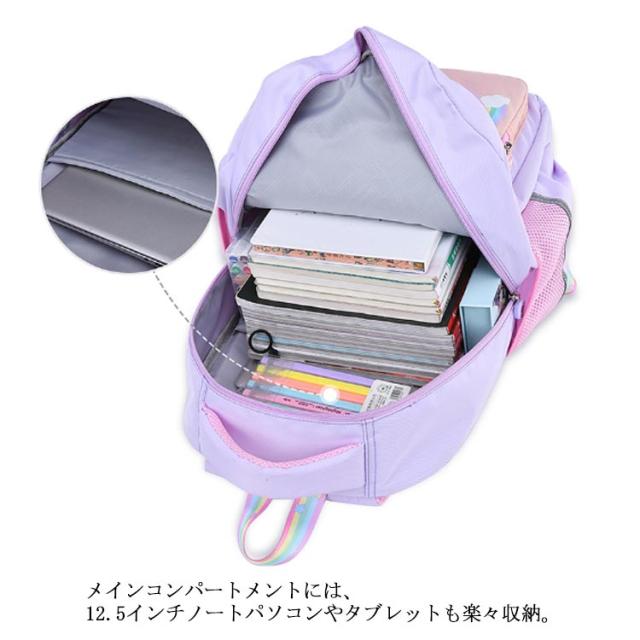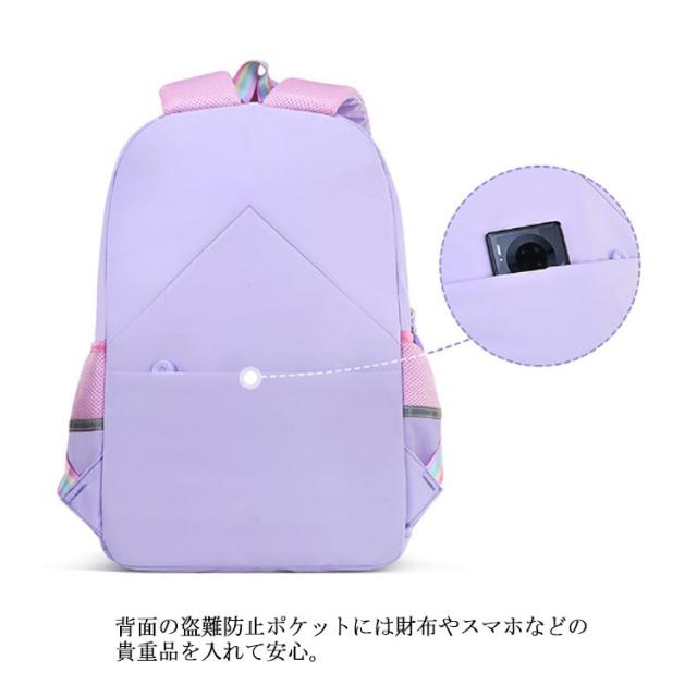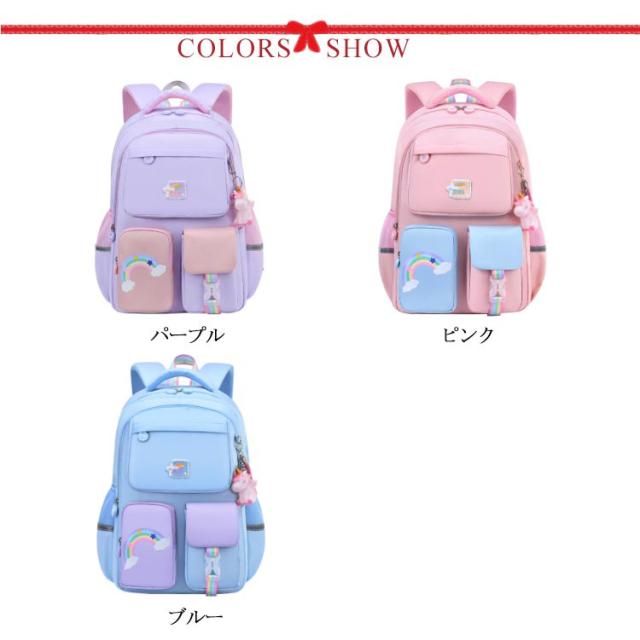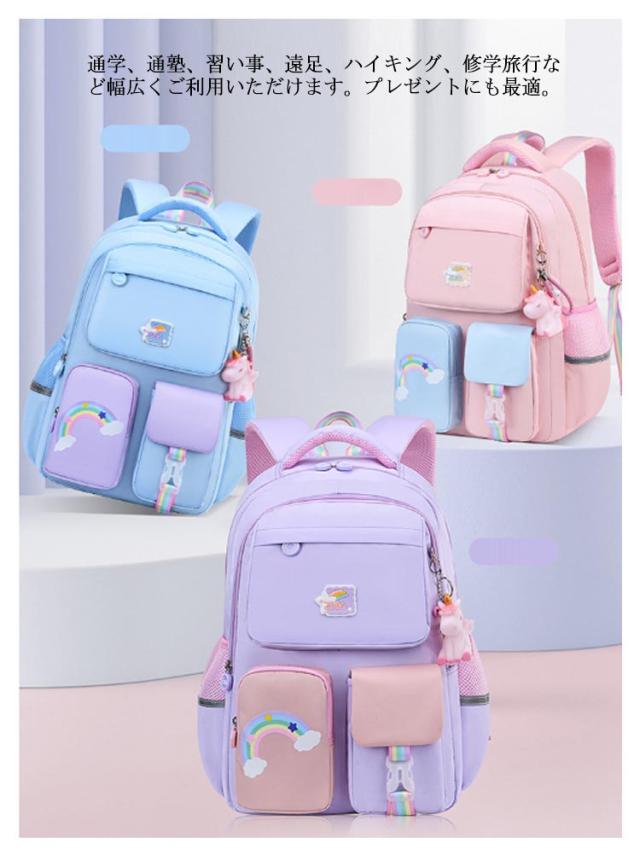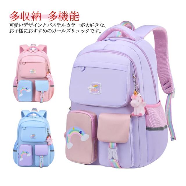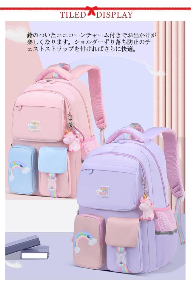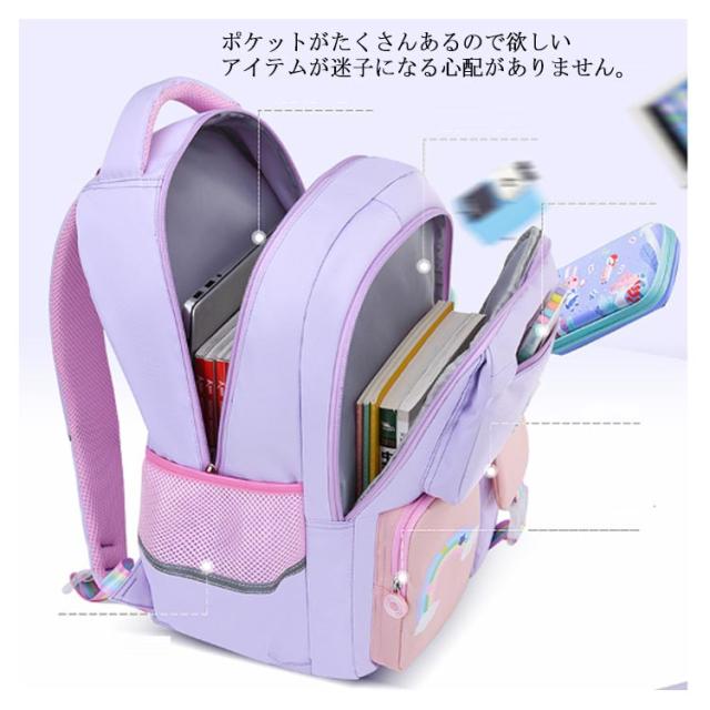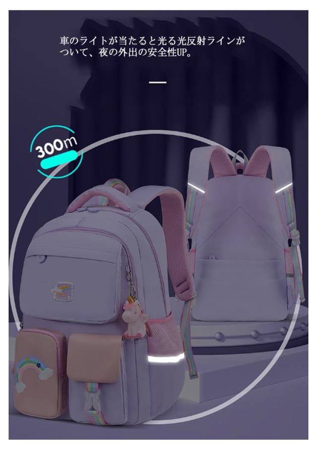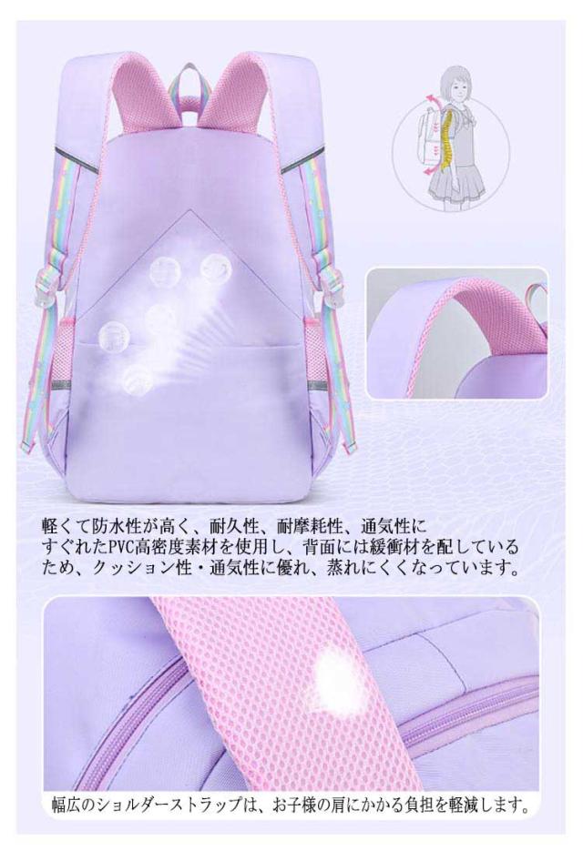 | 可愛いデザインとパステルカラーが大好きな、お子様におすすめのガールズリュックです。鈴のついたユニコーンチャーム付きでお出かけが楽しくなります。ショルダーずり落ち防止のチェストストラップを付ければさらに快適。通学、通塾、習い事、遠足、ハイキング、修学旅行など幅広くご利用いただけます。プレゼントにも最適。 【軽量&フィット性】軽くて防水性が高く、耐久性、耐摩耗性、通気性にすぐれたPVC高密度素材を使用し、背面には緩衝材を配しているため、クッション性・通気性に優れ、蒸れにくくなっています。幅広のショルダーストラップは、お子様の肩にかかる負担を軽減します。 【大容量】メインコンパートメントには、12.5インチノートパソコンやタブレットも楽々収納。A4サイズの本や教科書、ノート、水筒などもすっきり収納できます。ポケットがたくさんあるので欲しいアイテムが迷子になる心配がありません。 【安心安全】背面の盗難防止ポケットには財布やスマホなどの貴重品を入れて安心。車のライトが当たると光る光反射ラインがついて、夜の外出の安全性UP。 | |