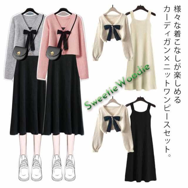 カーディガン ニットワンピース セット ニット セットアップ ニットカーディガン ニット キャミワンピース 2点セット 長袖 リボン付き ショート丈 トップス Aライン フレアワンピース ミモレ丈 ロングワンピ レイヤード風 かわいい おしゃれ カジュアル オフィス 春 秋 冬