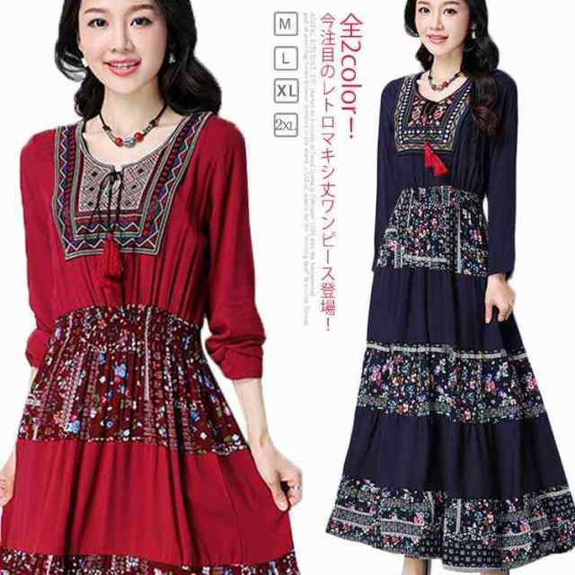 エスニック風×小花柄がトレロ可愛い。ワンピース ロングワンピース マキシワンピース 綿麻 マキシ丈 ワンピース 刺繍入り ワンピ 春 秋 トレロワンピース エスニック柄 ゆったり 可愛い送料無料