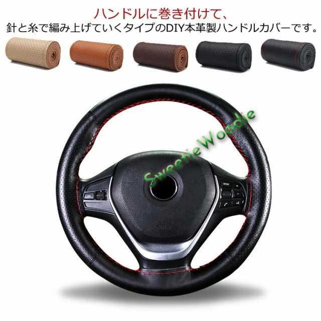 送料無料 牛革 手縫い ステアリングカバー 編み込み 秋 春 四季 本革 夏 牛革 レザー 冬 汎用 ハンドルカバー 滑り止め 汚れ防止 撥水 握りやすい 簡単装着 乗用車 内装用品 自動車用 軽自動車 編み上げタイプ 38cm