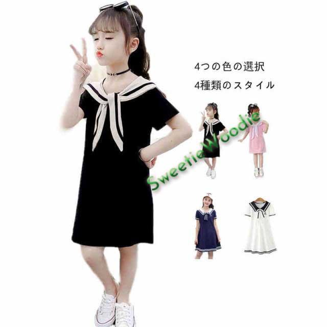 ジュニア シャツワンピース ワンピース 女の子 ワンピース 半袖 ワンピ セーラー襟 子供服 セーラーワンピース 学院風ワンピース ロングワンピース キッズ Aライン リボン付き おしゃれワンピ カジュアル かわいい おしゃれ ガールズ 半袖