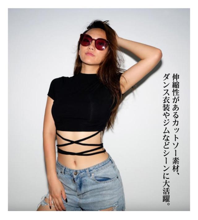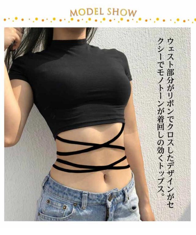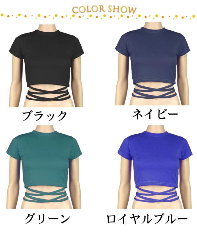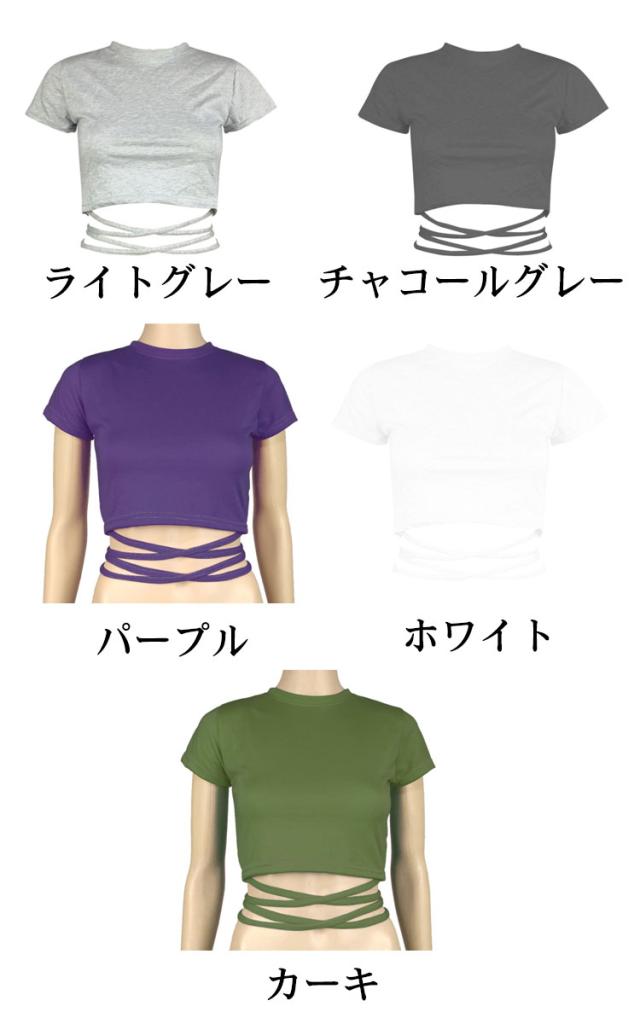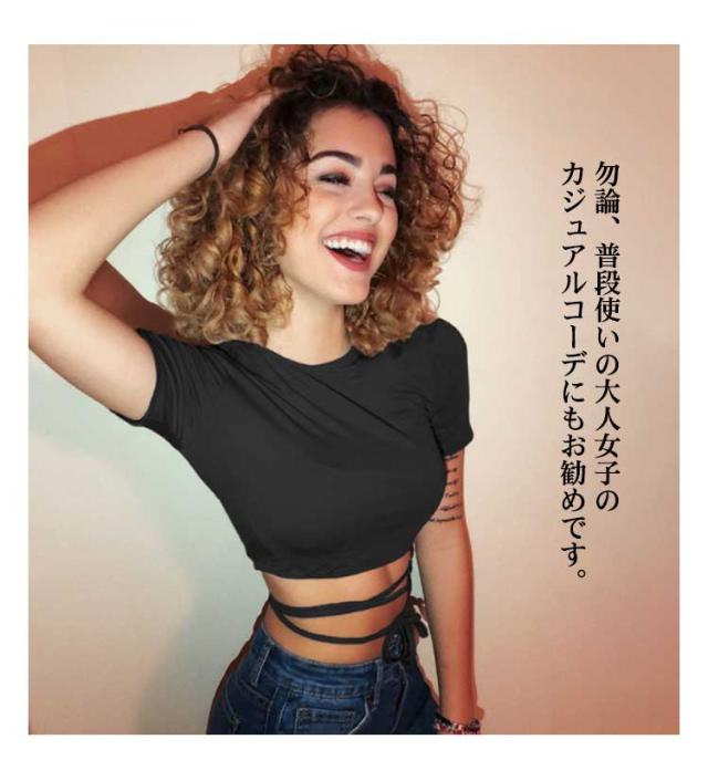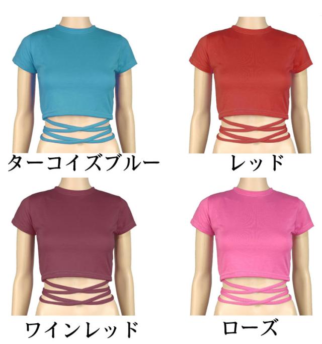| ヘルシーに肌見せするへそ出し半袖Tシャツ。 ウェスト部分がリボンでクロスしたデザインがセクシーでモノトーンが着回しの効くトップス。 伸縮性があるカットソー素材、ダンス衣装やジムなどシーンに大活躍。 勿論、普段使いの大人女子のカジュアルコーデにもお勧めです。 | |