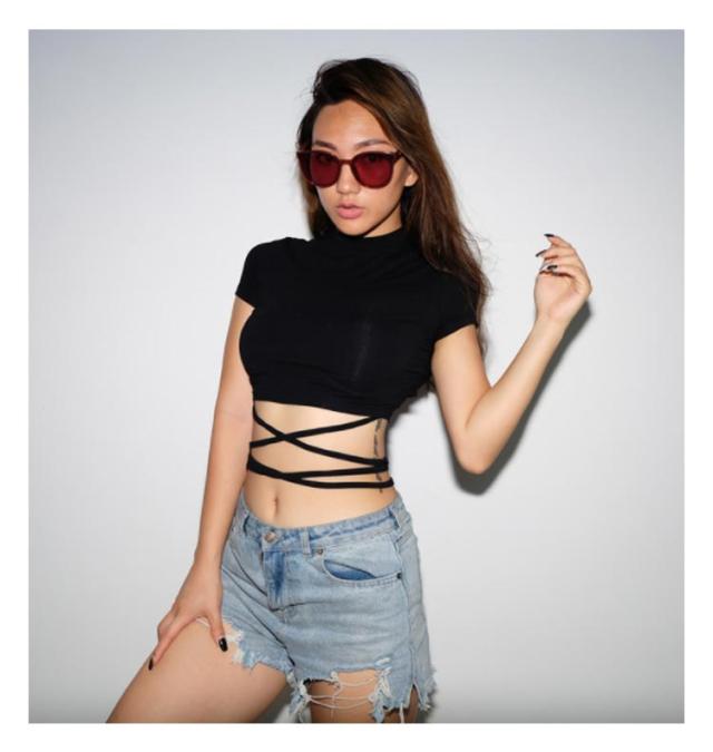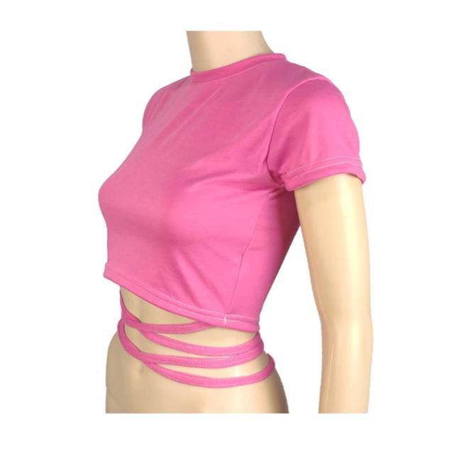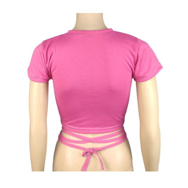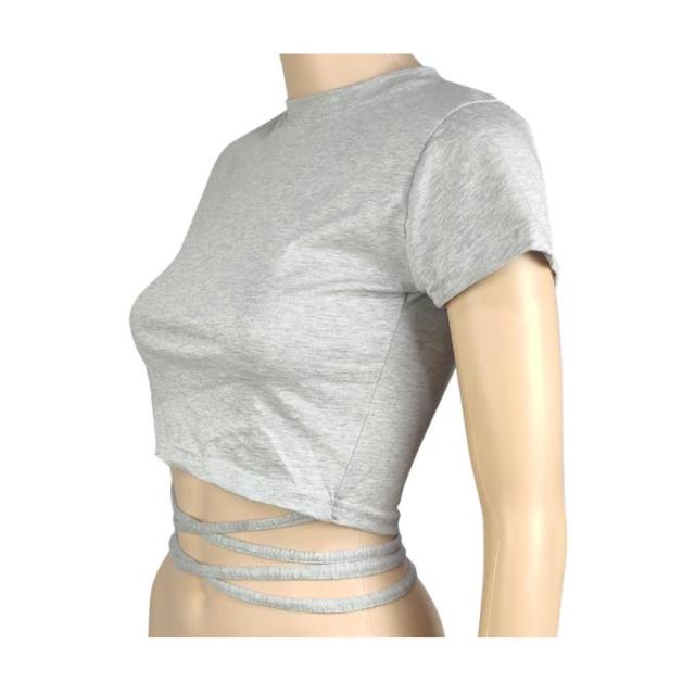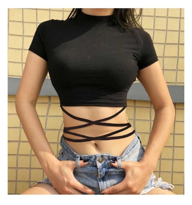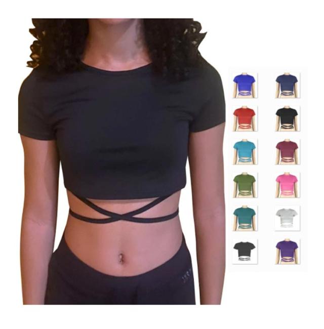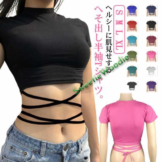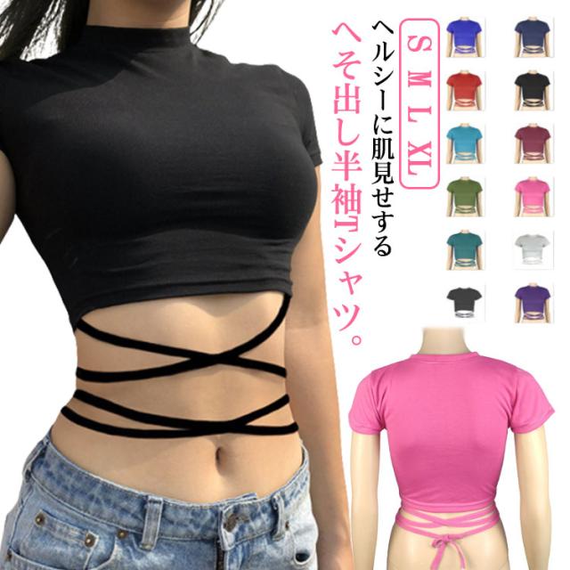 | ヘルシーに肌見せするへそ出し半袖Tシャツ。 ウェスト部分がリボンでクロスしたデザインがセクシーでモノトーンが着回しの効くトップス。 伸縮性があるカットソー素材、ダンス衣装やジムなどシーンに大活躍。 勿論、普段使いの大人女子のカジュアルコーデにもお勧めです。 | |