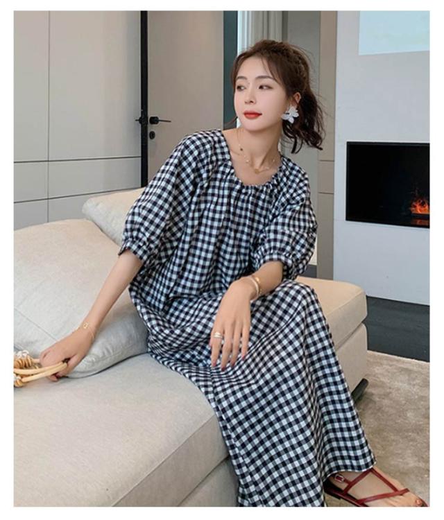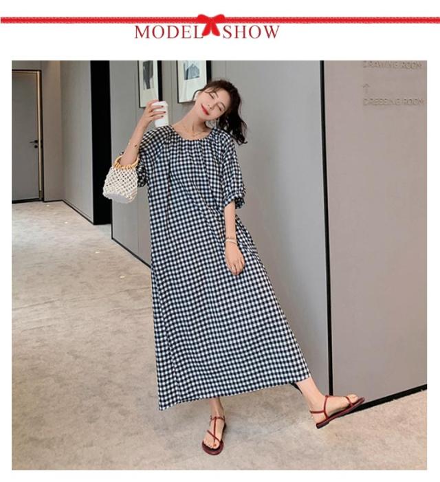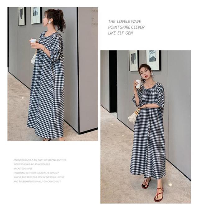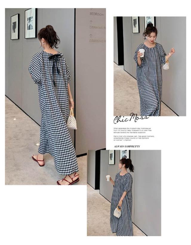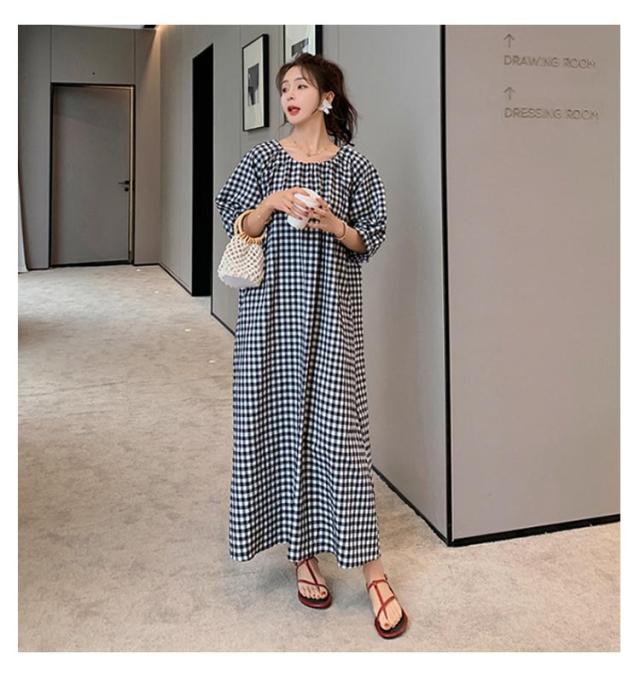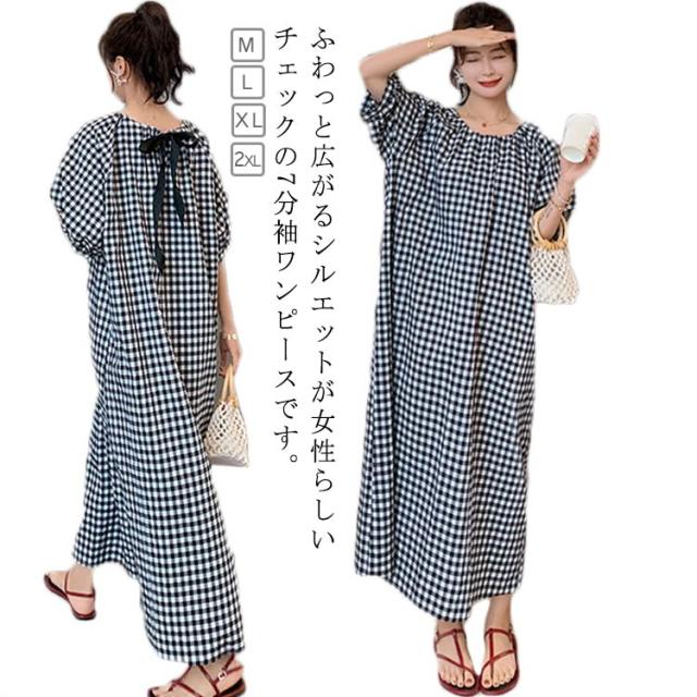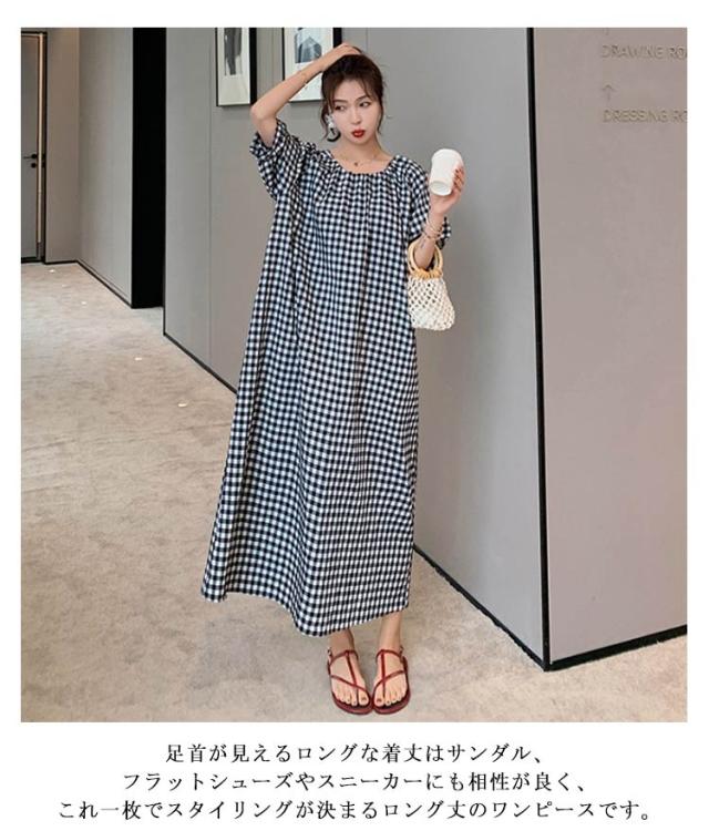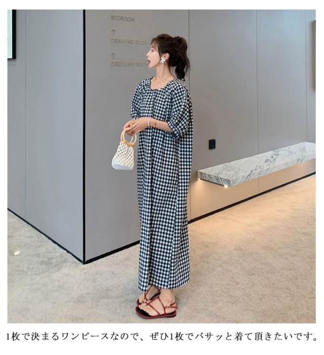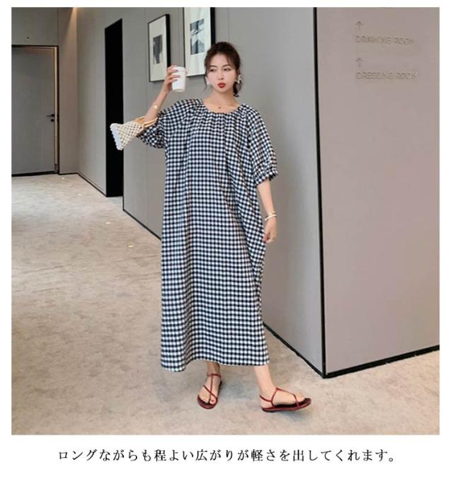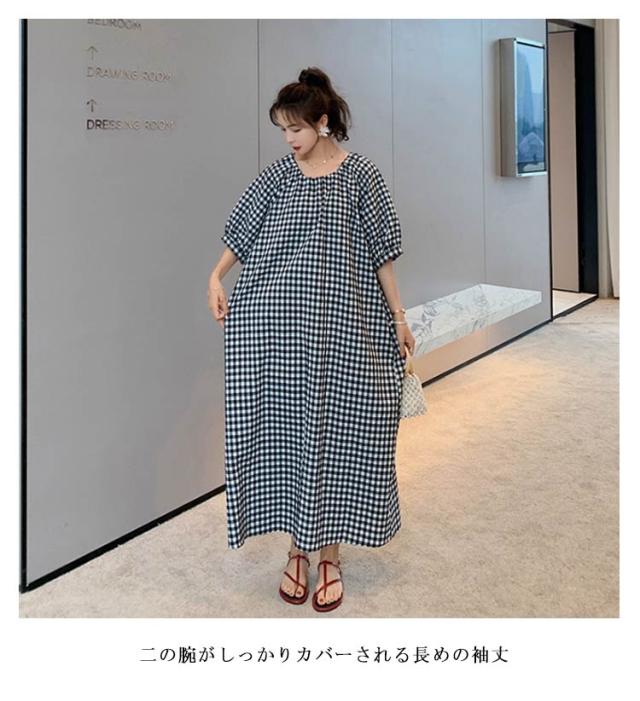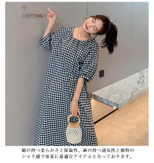 ロング 50代 綿麻混 ロングワンピ チェック柄 ロングワンピース リネン ゆったり Iライン コットン 体型カバー ワンピース レディース ビッグシルエット ワンピース マタニティウェア 韓国風 大人 カジュアル 30代 40代 7分袖