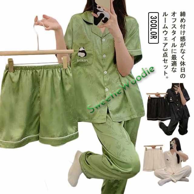 ナイトウェア ルームウェア 半ズボン 3点セット 超かわいいパンダ柄!接触冷感 前開き パジャマ レディース 長ズボン 寝巻 大きいサイズ 可愛い セットアップ XL パンツ アイスシルク トップス お洒落 M L 半袖