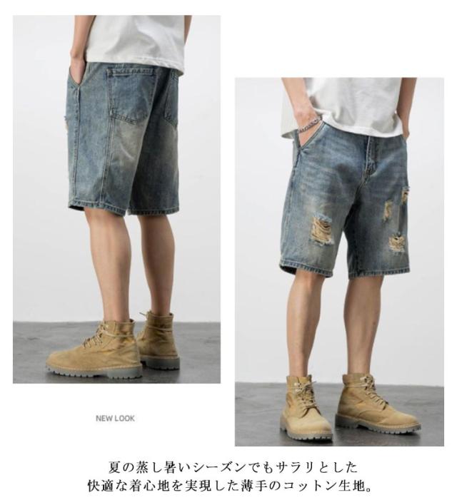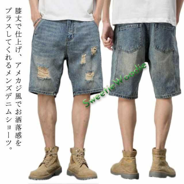 ショートパンツ ゆったり デニム ハーフパンツ 膝上 ダメージ加工 短パン 送料無料 ジーンズ メンズ ズボン 夏 太い ダメージ加工 大きいサイズ 男性 ワークパンツ ショートパンツ