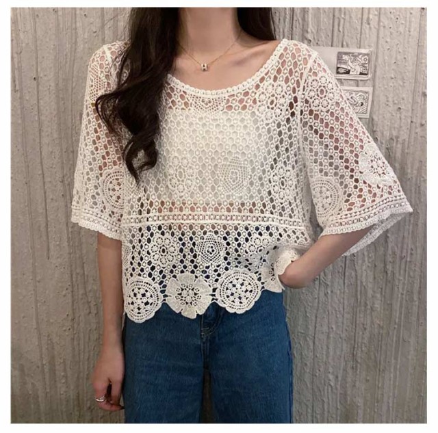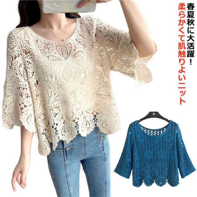 透かし編み レース編み カットソー 夏 長袖 五分袖 春 OL トップス 春夏 ニットブラウス 大人 レディース 丸ネック ドルマン かぎ編み きれいめ カジュアル シースルー ドルマンスリーブ 通勤 ゆったり ニット セーター プルオーバー クロシェニット サマーニット