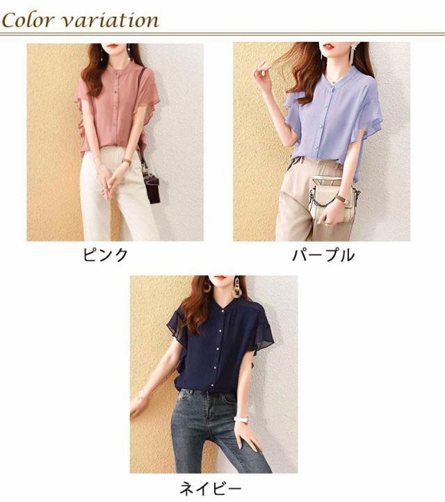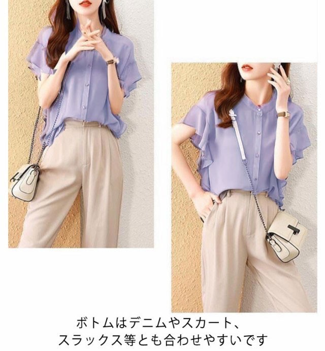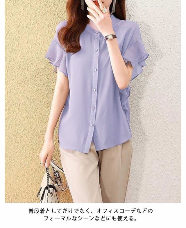 レディース トップス 前開きシャツ フレアスリーブ 薄手 半袖ブラウス パーティー 夏コーデ フレア袖 フリル 無地 フレンチスリーブ フォーマル シャツ オフィス カジュアル 通勤 OL 結婚式 ブラウス