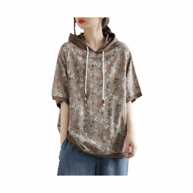 ゆったり 夏 5分丈袖 パーカー レディース パーカー トップス ショート丈 半袖Tシャツ 花柄パーカー パーカー 花柄Tシャツ 春 アウター フード付き トップス 花柄シャツ 5分丈袖シャツ おしゃれ