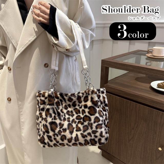 ショルダーバッグ レディース 女性 鞄 カバン 横長 長方形 チャック ファスナー チェーン フェイクファー 総柄 レオパード