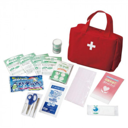 商品詳細:小型バッグで携帯できる本格的な救急バッグセット。 生産国:バッグ:中国 素材・材質:救急バッグ:ポリエステル 商品サイズ:救急バッグ:100×230×155mm 仕様:雑貨救急絆創膏【医療機器届出番号:27B2X00110000008】 セット内容:救急バッグ、カット綿×3枚、カットガーゼ×3枚、包帯、救急絆創膏2サイズ×3枚、サージカルテープ、清浄綿2枚入×3包、ハサミ、ピンセット、耳かき、毛抜き、熱救急シート2枚、冷却パック、ECO便利バッグ、マスク、応急手当ポケットブック