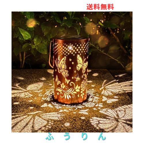 【光と影を楽しむソーラーランタン】外観はアンティーク調で置くだけでおしゃれになります。透かし彫り設計で、暗くなると蝶と花の柄から光がこぼれ、幻想的な光と影を演出してくれます。夜の庭をより美しい雰囲気にライトアップできます。
