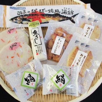 ■:白蒸しかまぼこえび×2枚、魚さし100g×1本、とうふの蒲鉾絹×2個、いわきからの贈り物(キンキ焼かまぼこ)3枚×2袋、さんまのぽーぽー焼風蒲鉾×1枚、揚げかまぼこ紅しょうが天80g×1袋