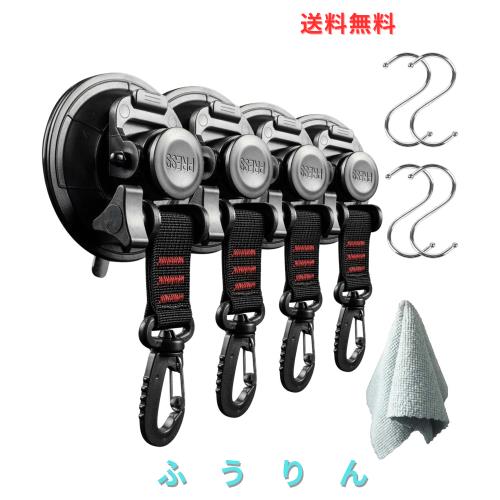 【強力真空吸盤フックセット】セット内容:吸盤フック4個、S字フック4個、タオル1枚。360度回転しロック式の自由度の高いフックです。使用前に付属のタオルでガラスを拭くことができます。車のサイドテントやサンシェードの固定に使う場合は取付穴の種類によってS字フックを選択することができます。吸盤素材:PVC+ABS・サイズ:直径9cm*厚さ4cm・耐荷重:静止状態で30kg
