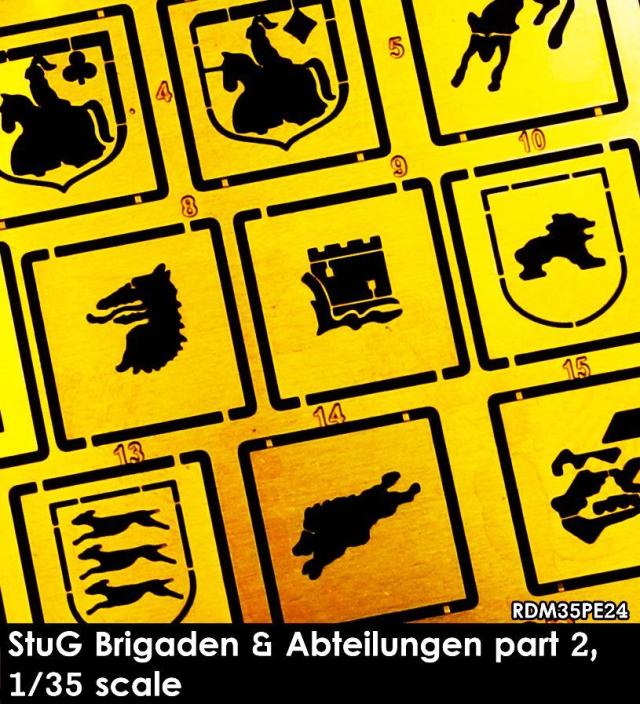 ドイツ軍の突撃砲旅団や突撃砲大隊に所属するIII号突撃砲などに描かれている部隊マーキングを塗装で再現できる、1/35スケール用エッチング製テンプレートセットの第二弾です。