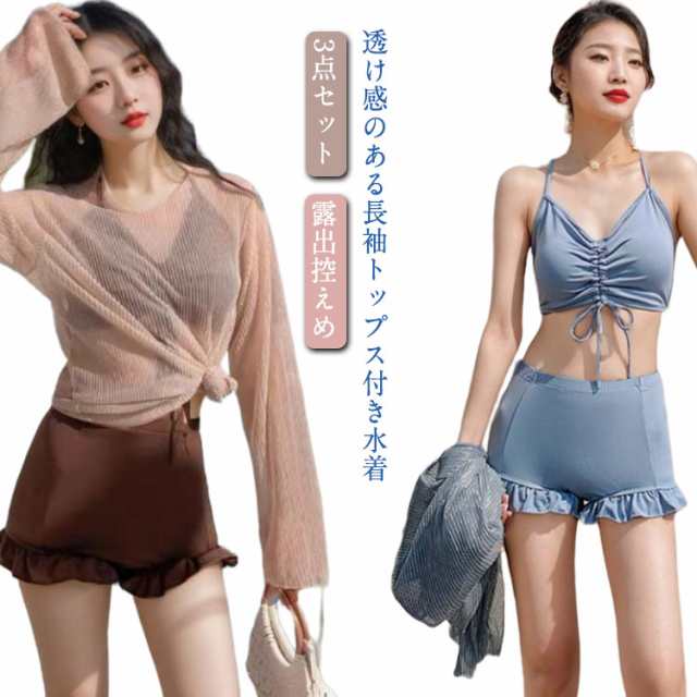 | オシャレ魅せしながらさりげなく体型カバー。 透け感のある長袖トップス付き水着3点セット。 シアートップスでお洒落に体型カバー。 水着を着慣れていない方や露出を抑えたい方にお勧めのビキニ3点セット。 可愛いフリル裾デザインのショートパンツ、裾が広めなので脚の細見せ効果◎ トップスをそのままおろすと腹周りを抑えて、さりげなく体型カバー!結ぶと可愛く腹見えに、大胆に大人アピール。 | |