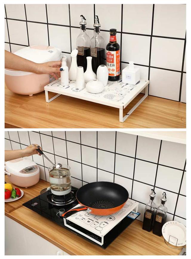 | ガスコンロの上が収納・作業スペースに早変わり! 調理中のちょい置きはもちろん、配膳台としても活躍します。 金属製、生活感が出がちなコンロ周りにスタイリッシュなスペースに。 掃除も簡単で長持ちします! コンロの上を作業スペースとして使えるうえ、汚れやほこりも防げます。 | |