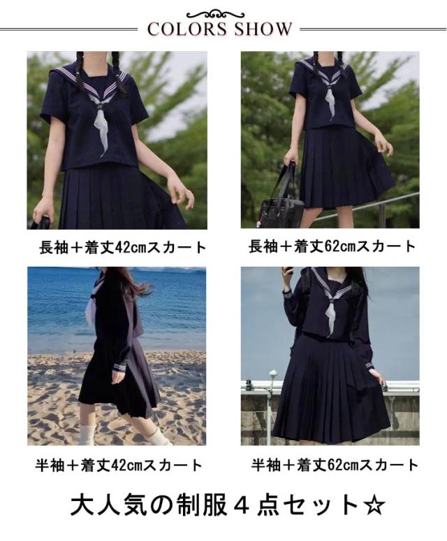 | 大人気の制服4点セット☆ セーラー襟トップス+プリーツスカート+ネクタイ+ソックスの4点セットです。 「誰でも可愛く着れるシルエット」「学校にも安心の高品質」「学校以外も大活躍」のポイントにこだわった1着! 放課後やテーマパークでも映え必至☆☆☆ | |