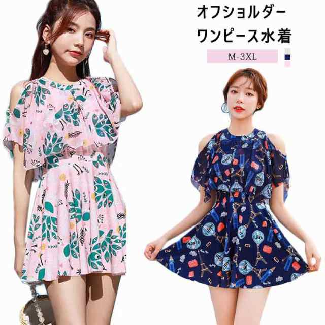 ワンピース水着 体型カバー水着 レディース ママ水着 オフショルダー オールインワン フレア ぽっちゃり 二の腕 カバーアップ XXL 3L 4L 女性 オトナ女子 20代 30代 40代 露出控えめ 送料無料