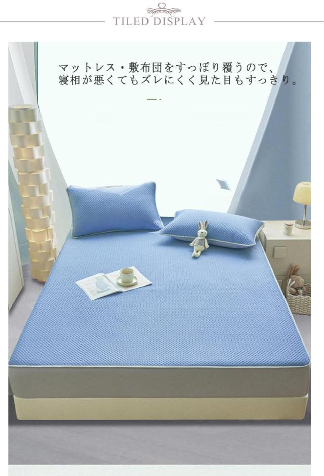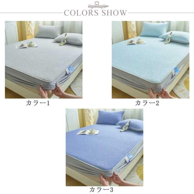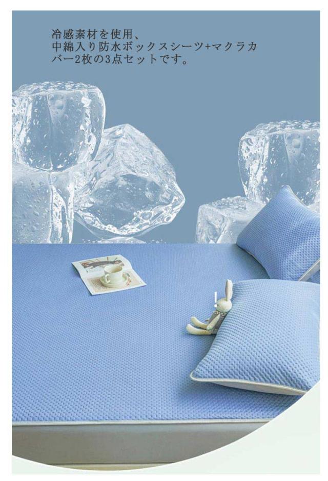 | 冷感素材を使用、中綿入り防水ボックスシーツ+マクラカバー2枚の3点セットです。 マットレス・敷布団をすっぽり覆うので、寝相が悪くてもズレにくく見た目もすっきり。 ご家庭で洗濯できるので、汗ばむ季節でも毎日清潔にご使用いただけます。お子様やペットがいるご家庭にもオススメ。 | |