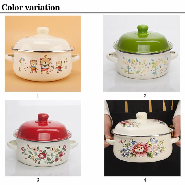 | かわいい花柄/クマ柄のホーロー両手鍋。【16cm】【全16種柄】 ホーローは表面がガラス質なので酸や塩分に強く、におい移りが少なく衛生的です。 耐熱性が高く保温性にも優れていますので、カレー、シチュー、ポトフなどの煮込み料理にも最適です。 食卓を彩るお洒落なデザインも魅力です。 お鍋のままテーブルにお料理を出すと、お料理が冷めにくく温かい状態を保つことができます。 ガス火はもちろん、IHにもお使いいただけます。 | |