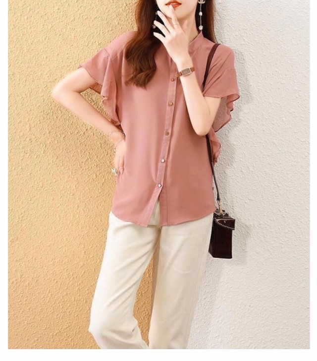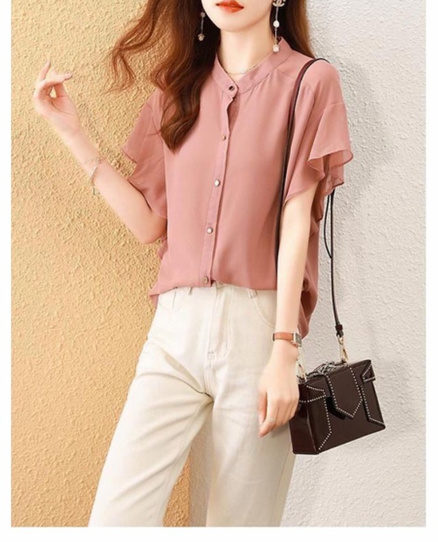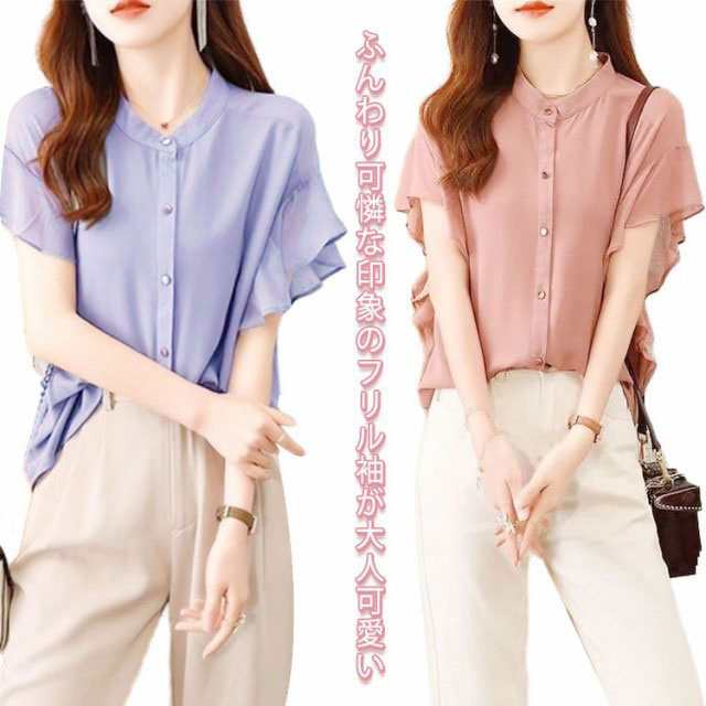 レディース トップス 前開きシャツ フレアスリーブ 薄手 半袖ブラウス パーティー 夏コーデ フレア袖 フリル 無地 フレンチスリーブ フォーマル シャツ オフィス カジュアル 通勤 OL 結婚式 ブラウス