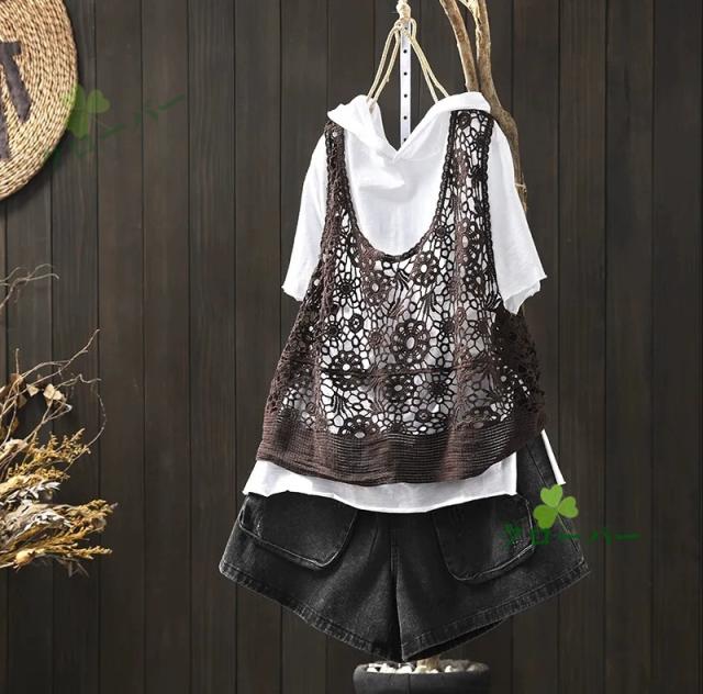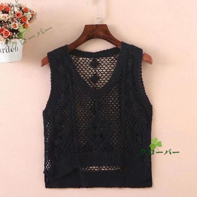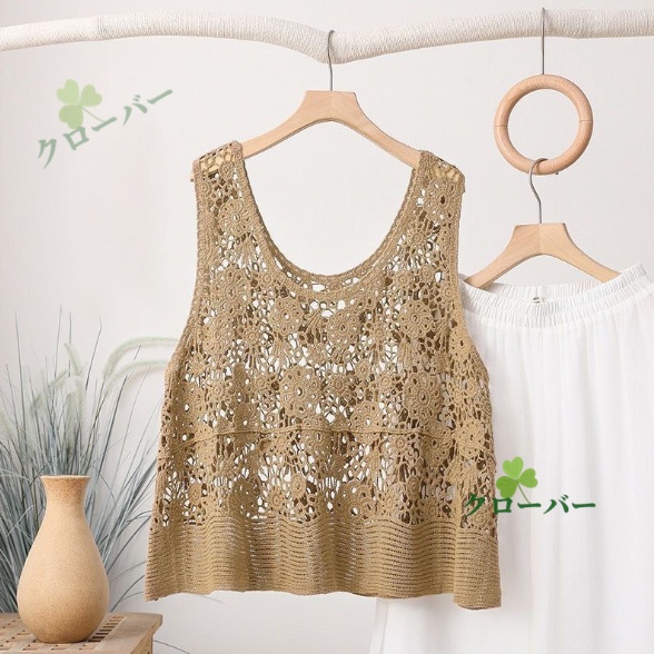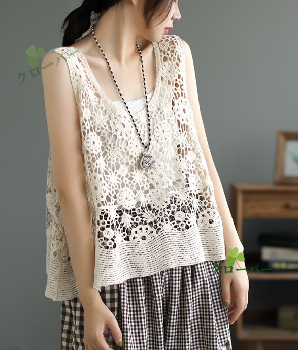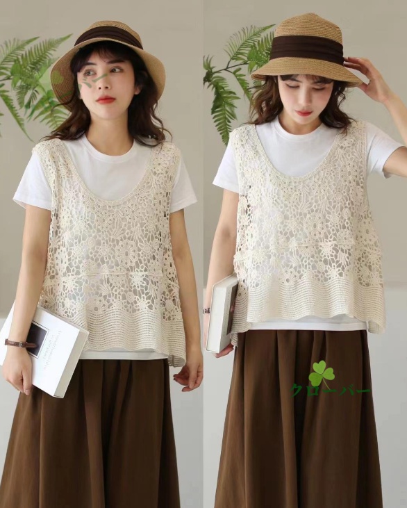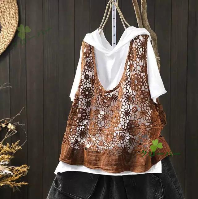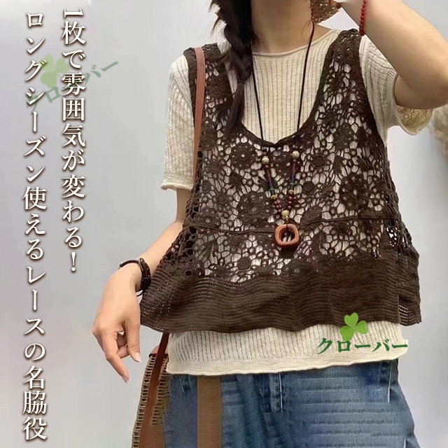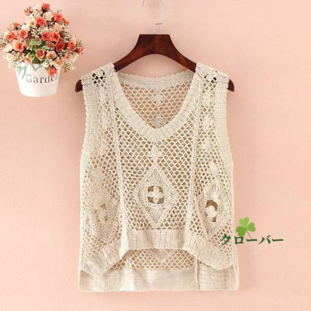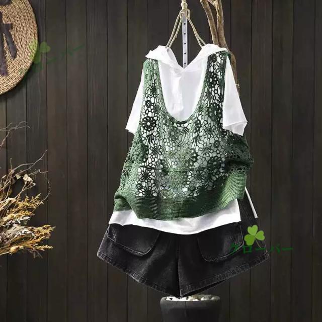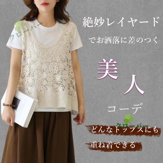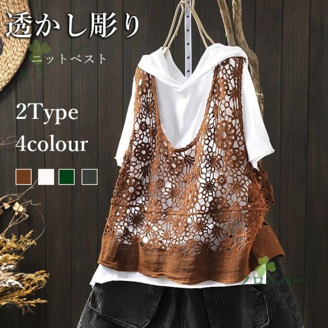 ベスト 透かし編み レディース 花柄 サマーニット ジレ トップス ロング ロングベスト ロングジレ ノースリーブ 薄手 ワンピース ワンピ 重ね着 体型カバー レース編み 無地 ゆったり